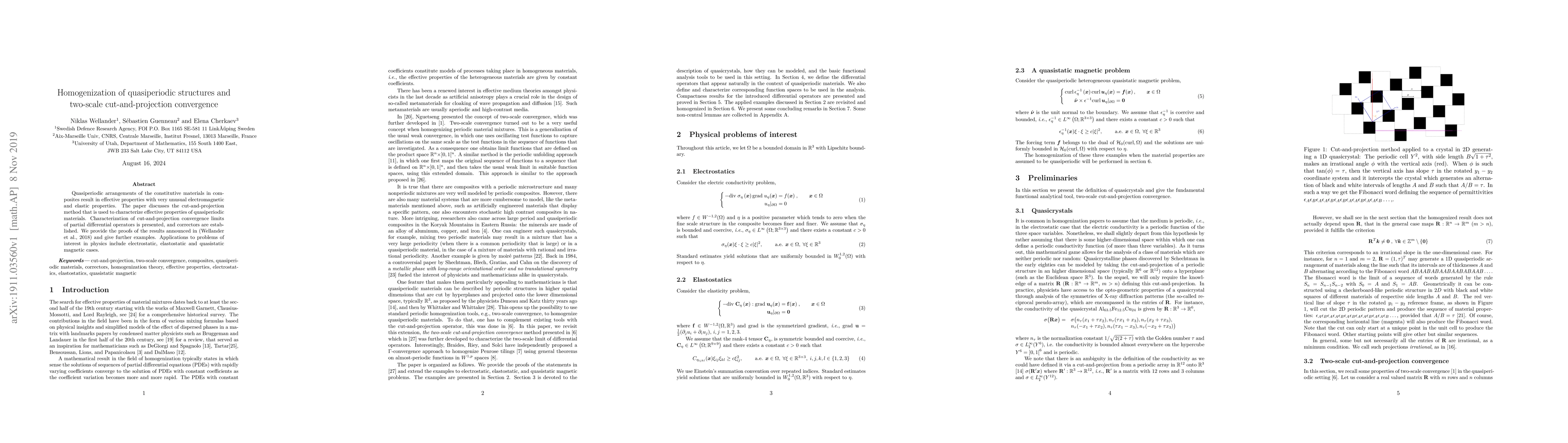This paper explores the homogenization of quasiperiodic structures using the cut-and-projection method to characterize their effective electromagnetic and elastic properties. It establishes convergence limits for partial differential operators and provides proofs for the results announced in a previous study, with applications to electrostatic, elastostatic, and quasistatic magnetic problems.