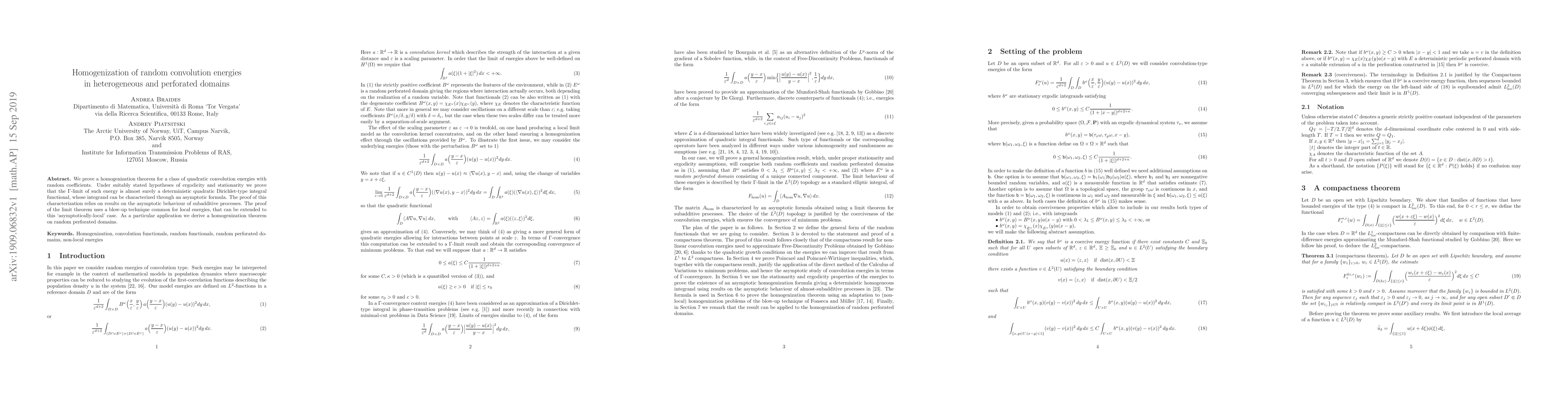 This paper proves a homogenization theorem for quadratic convolution energies with random coefficients, demonstrating that the $\Gamma$-limit converges to a deterministic quadratic integral functional under ergodicity and stationarity. The proof employs asymptotic behavior of subadditive processes and a blow-up technique, with an application to random perforated domains.
