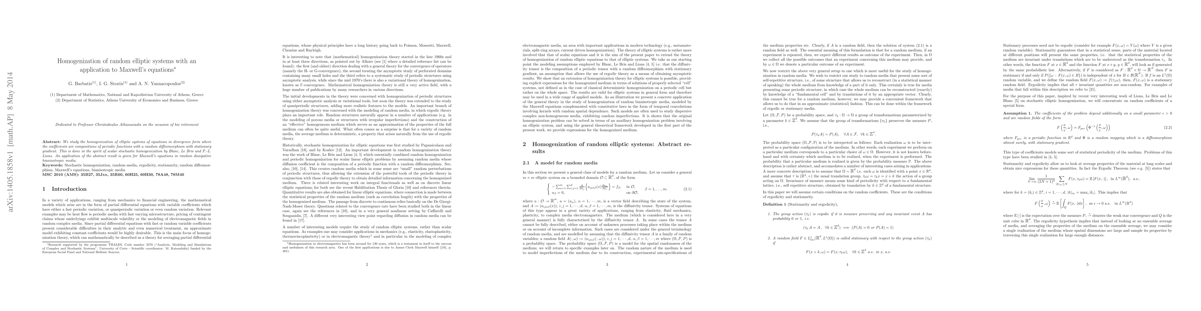This paper investigates the homogenization of random elliptic systems, focusing on the divergence form with coefficients influenced by random diffeomorphisms. The findings are applied to Maxwell's equations in random dissipative bianisotropic media, extending scalar stochastic homogenization techniques.