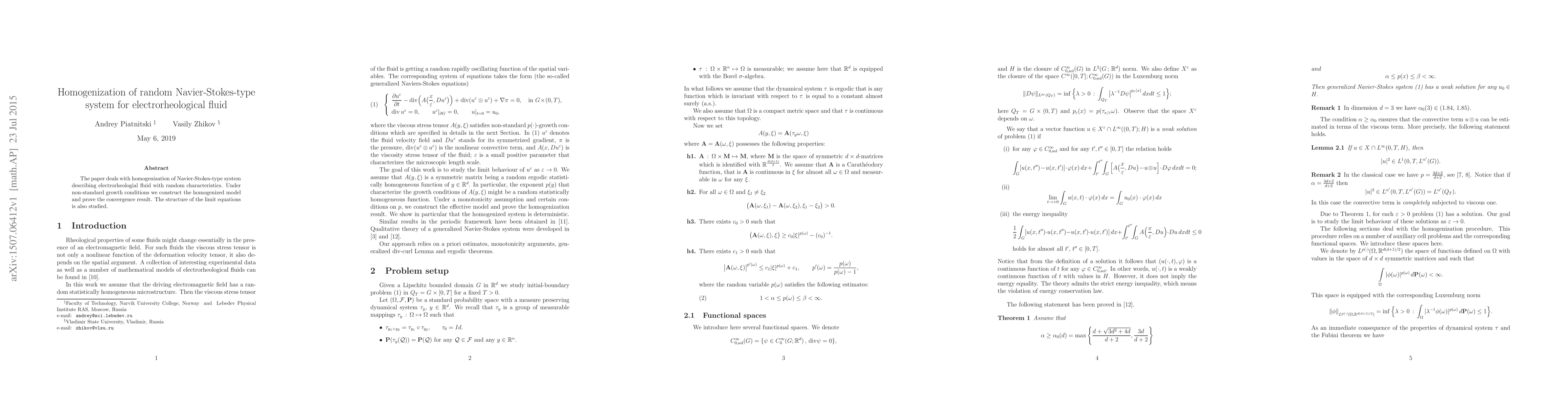 Summary: This paper constructs a homogenized model for a Navier-Stokes-type system governing electrorheological fluid with random properties, under non-standard growth conditions, and proves convergence, while also analyzing the structure of the resulting limit equations.