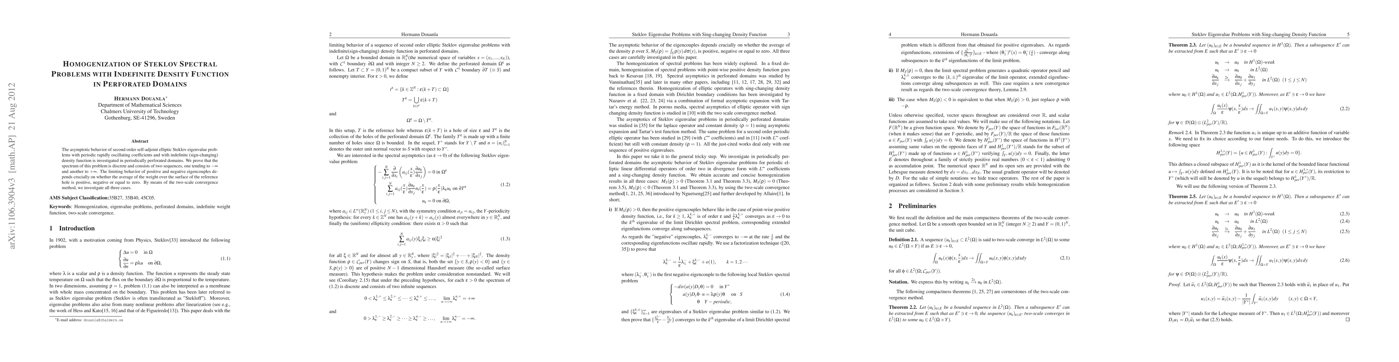 The asymptotic behavior of second order self-adjoint elliptic Steklov eigenvalue problems with periodic rapidly oscillating coefficients and with indefinite (sign-changing) density function is investigated in periodically perforated domains. We prove that the spectrum of this problem is discrete and consists of two sequences, one tending to -{\infty} and another to +{\infty}. The limiting behavior of positive and negative eigencouples depends crucially on whether the average of the weight over the surface of the reference hole is positive, negative or equal to zero. By means of the two-scale convergence method, we investigate all three cases.