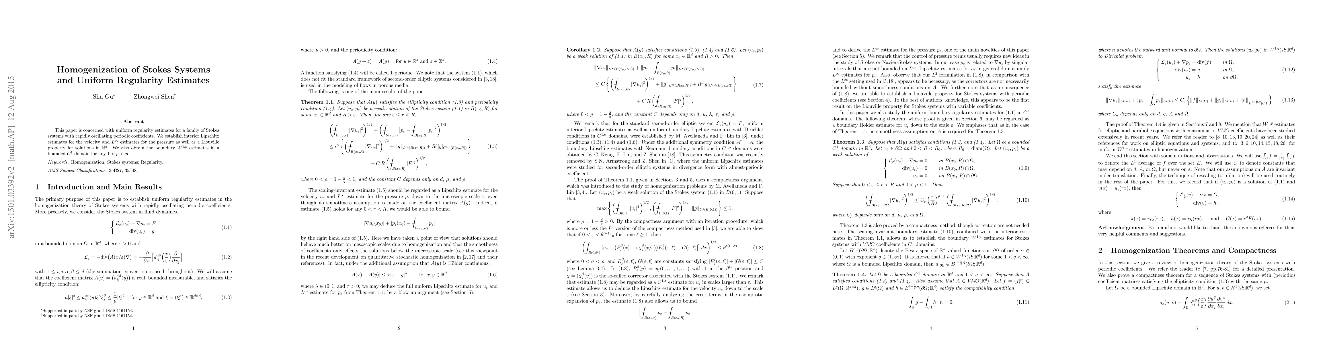 This paper is concerned with uniform regularity estimates for a family of Stokes systems with rapidly oscillating periodic coefficients. We establish interior Lipschitz estimates for the velocity and $L^\infty$ estimates for the pressure as well as a Liouville property for solutions in $\mathbb{R}^d$. We also obtain the boundary $W^{1,p}$ estimates in a bounded $C^1$ domain for any $1