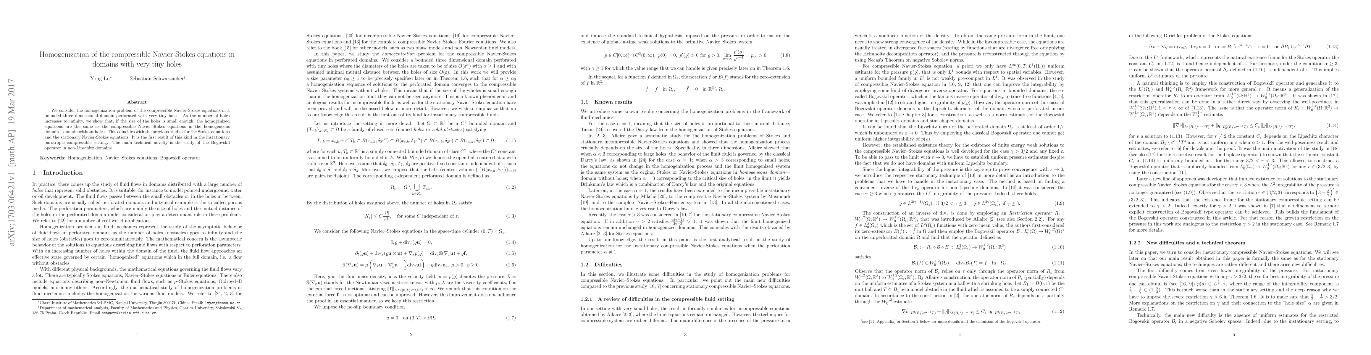 This paper studies the homogenization of compressible Navier-Stokes equations in a perforated domain with very small holes. It demonstrates that as the number of holes increases, the homogenized equations converge to the standard compressible Navier-Stokes equations in the homogeneous domain, marking the first such result for instationary barotropic compressible flows.