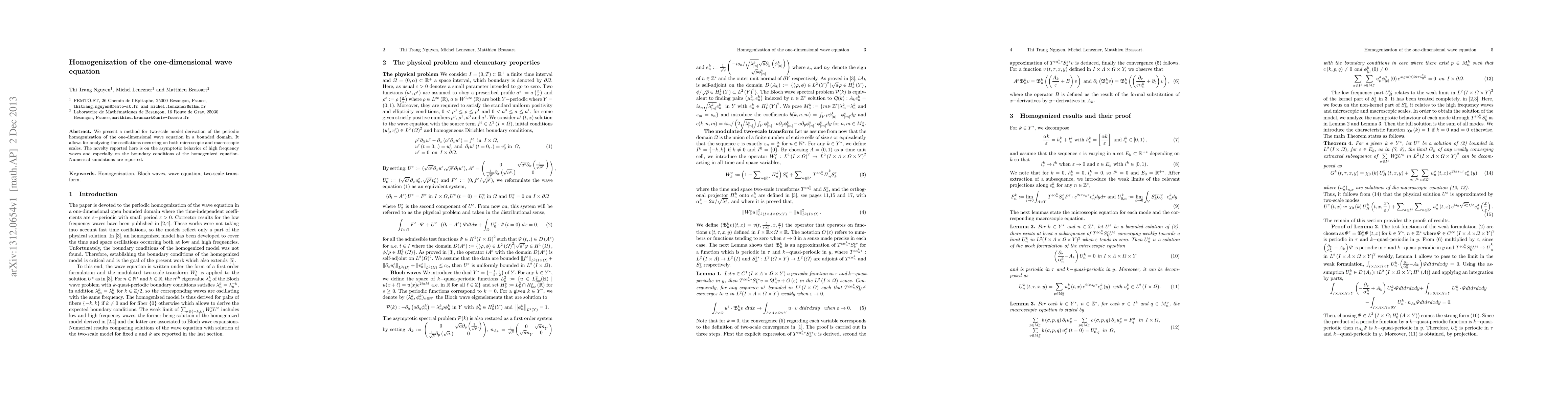 We present a method for two-scale model derivation of the periodic homogenization of the one-dimensional wave equation in a bounded domain. It allows for analyzing the oscillations occurring on both microscopic and macroscopic scales. The novelty reported here is on the asymptotic behavior of high frequency waves and especially on the boundary conditions of the homogenized equation. Numerical simulations are reported.