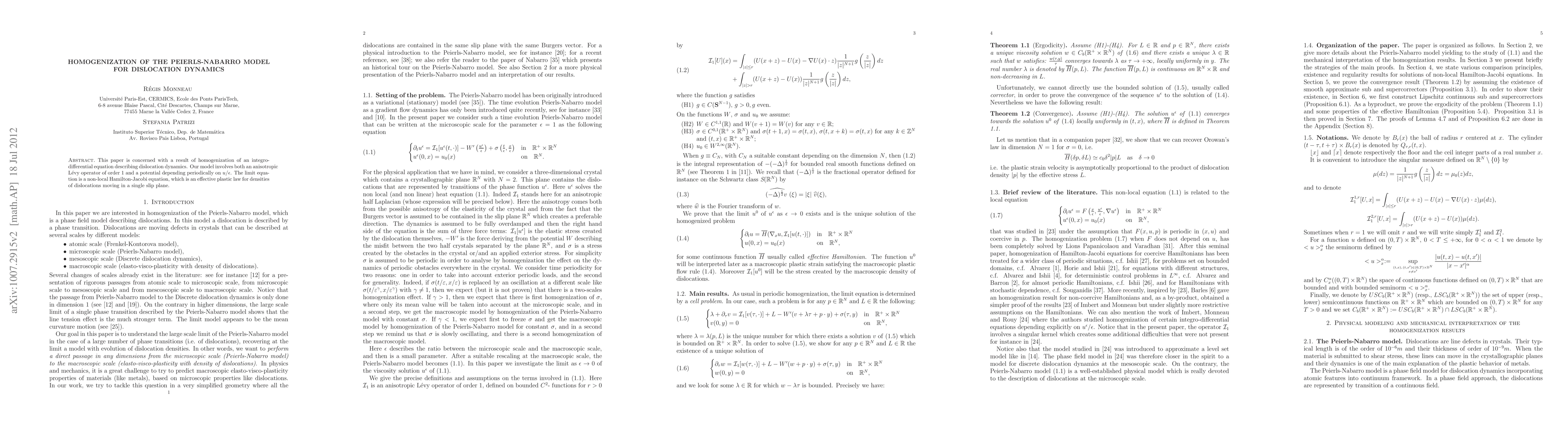 This paper is concerned with a result of homogenization of an integro-differential equation describing dislocation dynamics. Our model involves both an anisotropic L\'{e}vy operator of order 1 and a potential depending periodically on $u/\ep$. The limit equation is a non-local Hamilton-Jacobi equation, which is an effective plastic law for densities of dislocations moving in a single slip plane.