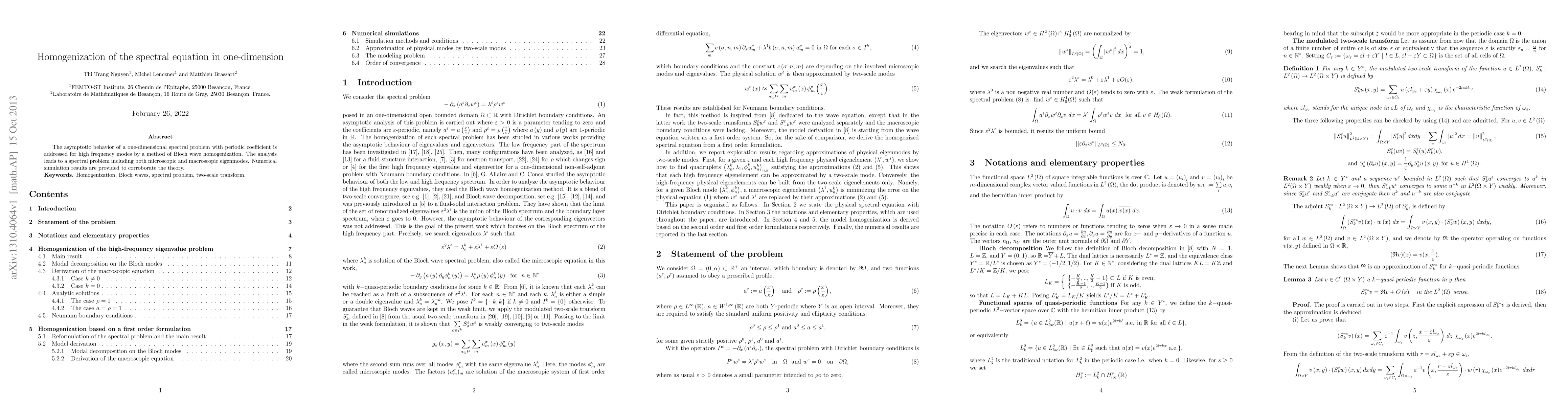 This paper investigates the high-frequency asymptotic behavior of a one-dimensional spectral problem with periodic coefficients using Bloch wave homogenization, revealing both microscopic and macroscopic eigenmodes, and validates the theory with numerical simulations.