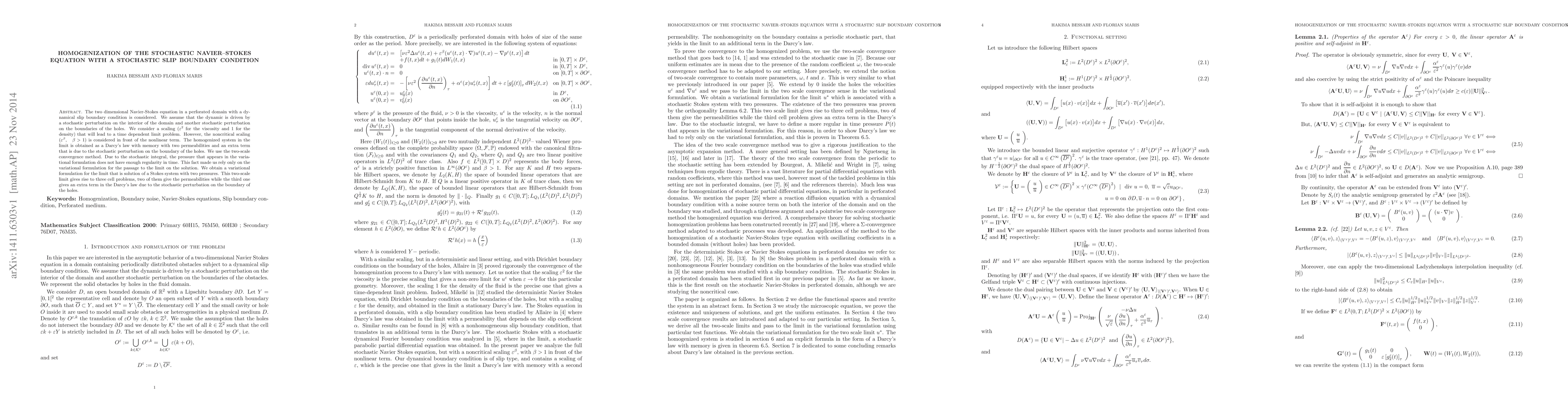 The paper presents a detailed homogenization process for the stochastic Navier-Stokes equation with slip boundary conditions, leading to a novel Darcy's law with memory and two permeabilities, enriched by stochastic terms from boundary perturbations.