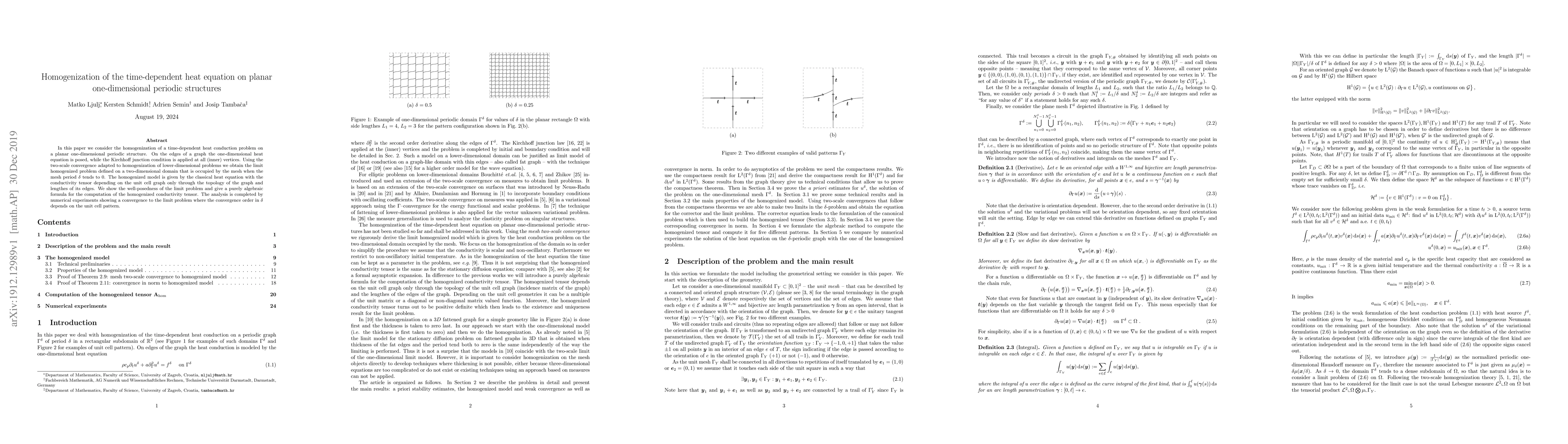 This paper studies the homogenization of a time-dependent heat equation on a planar one-dimensional periodic structure, deriving a limit problem defined on a two-dimensional domain. The homogenized model is a classical heat equation with a conductivity tensor determined by the graph's topology and edge lengths, and a well-posedness proof and numerical experiments validate the convergence.