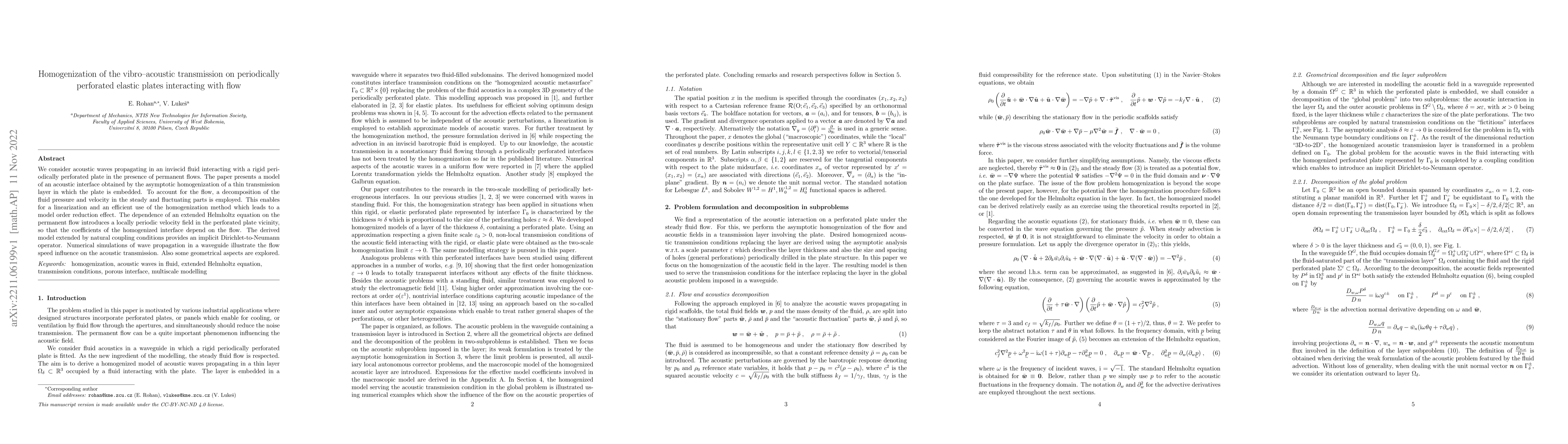 This paper explores the homogenization of vibro-acoustic transmission in periodically perforated elastic plates interacting with fluid flow, employing asymptotic homogenization to derive an efficient model. The model accounts for the flow by decomposing fluid pressure and velocity, leading to an extended Helmholtz equation dependent on flow speed, and is illustrated through numerical simulations.