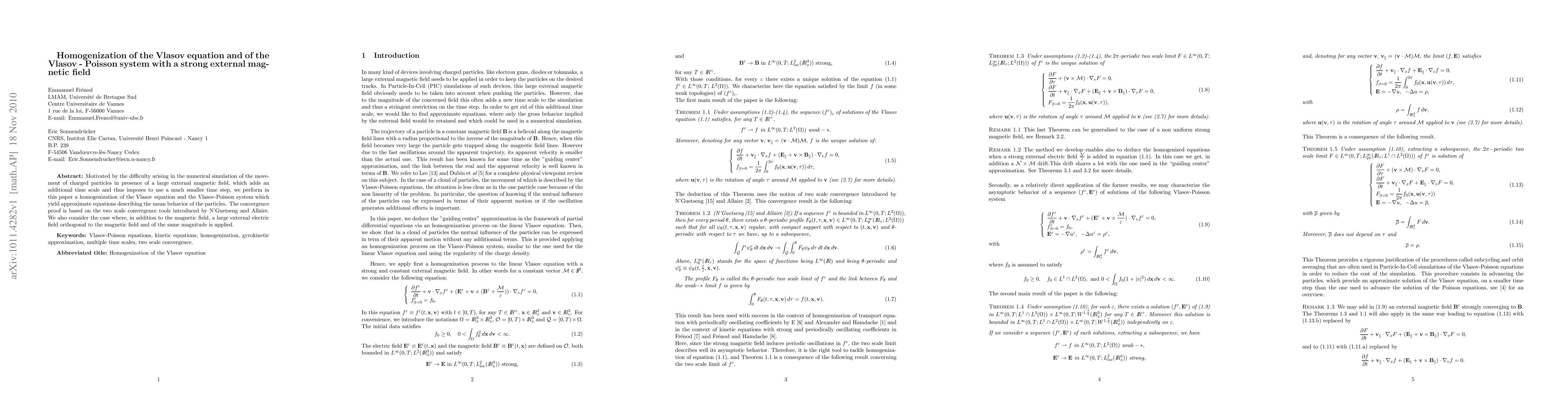 Motivated by the difficulty arising in the numerical simulation of the movement of charged particles in presence of a large external magnetic field, which adds an additional time scale and thus imposes to use a much smaller time step, we perform in this paper a homogenization of the Vlasov equation and of the Vlasov-Poisson system which yield approximate equations describing the mean behavior of the particles. The convergence proof is based on the two scale convergence tools introduced by N'Guetseng and Allaire. We also consider the case where, in addition to the magnetic field, a large external electric field orthogonal to the magnetic field and of the same magnitude is applied.