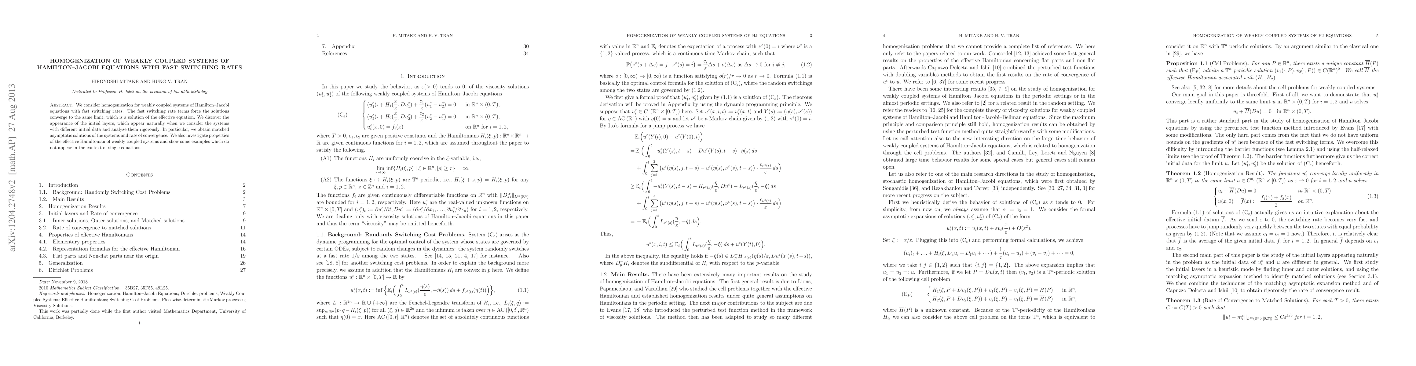 This paper studies the homogenization of weakly coupled Hamilton-Jacobi equations with fast switching rates, revealing the convergence of solutions to an effective equation and the emergence of initial layers. It provides matched asymptotic solutions and convergence rates, and explores unique properties of the effective Hamiltonian in coupled systems.