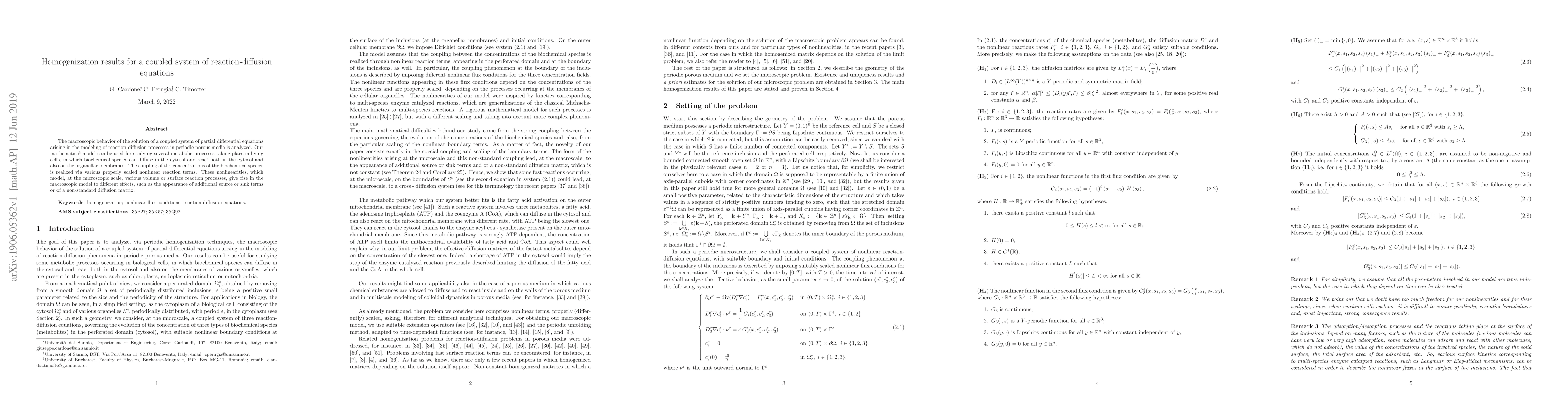 The macroscopic behavior of the solution of a coupled system of partial differential equations arising in the modeling of reaction-diffusion processes in periodic porous media is analyzed. Our mathematical model can be used for studying several metabolic processes taking place in living cells, in which biochemical species can diffuse in the cytosol and react both in the cytosol and also on the organellar membranes. The coupling of the concentrations of the biochemical species is realized via various properly scaled nonlinear reaction terms. These nonlinearities, which model, at the microscopic scale, various volume or surface reaction processes, give rise in the macroscopic model to different effects, such as the appearance of additional source or sink terms or of a non-standard diffusion matrix.