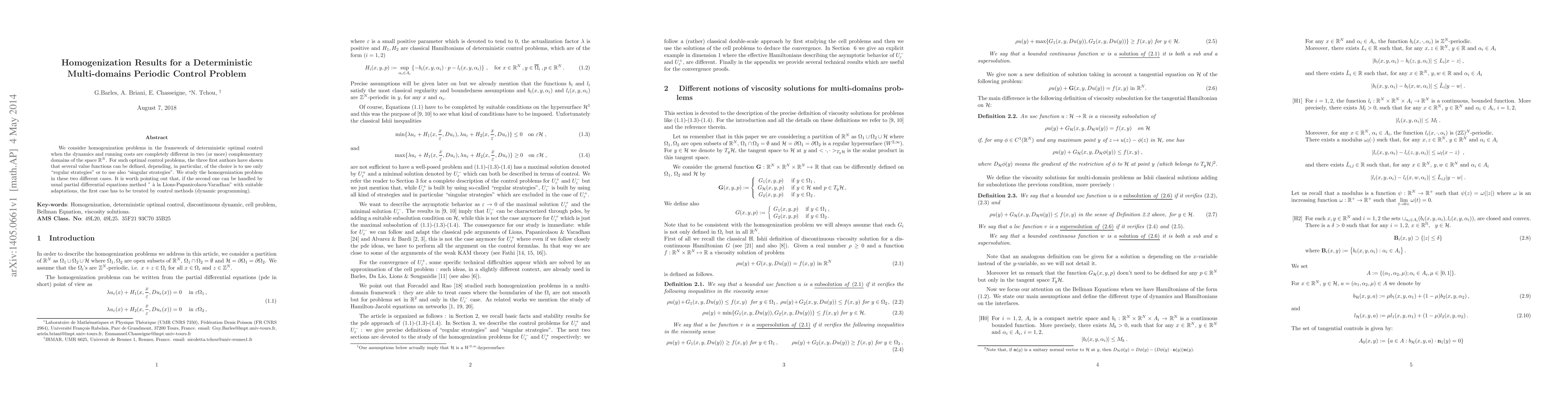 This paper studies homogenization problems in deterministic multi-domains periodic control, exploring two cases: using regular strategies and singular strategies, with implications for optimal control methods and partial differential equations.