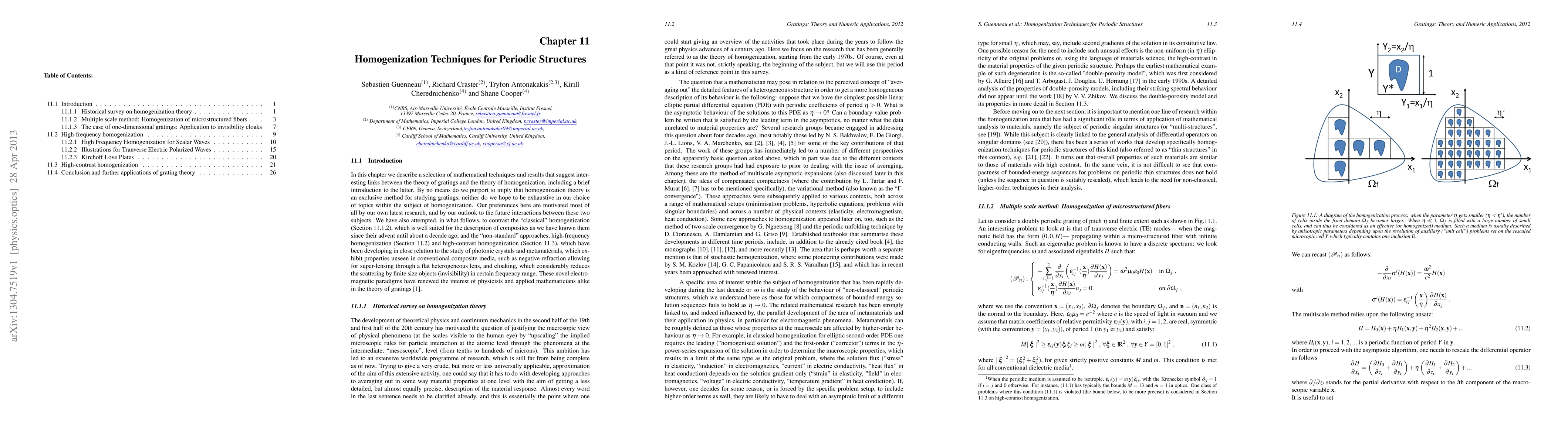 In this chapter we describe a selection of mathematical techniques and results that suggest interesting links between the theory of gratings and the theory of homogenization, including a brief introduction to the latter. By no means do we purport to imply that homogenization theory is an exclusive method for studying gratings, neither do we hope to be exhaustive in our choice of topics within the subject of homogenization. Our preferences here are motivated most of all by our own latest research, and by our outlook to the future interactions between these two subjects. We have also attempted, in what follows, to contrast the "classical" homogenization (Section 11.1.2), which is well suited for the description of composites as we have known them since their advent until about a decade ago, and the "non-standard" approaches, high-frequency homogenization (Section 11.2) and high-contrast homogenization (Section 11.3), which have been developing in close relation to the study of photonic crystals and metamaterials, which exhibit properties unseen in conventional composite media, such as negative refraction allowing for super-lensing through a flat heterogeneous lens, and cloaking, which considerably reduces the scattering by finite size objects (invisibility) in certain frequency range. These novel electromagnetic paradigms have renewed the interest of physicists and applied mathematicians alike in the theory of gratings.