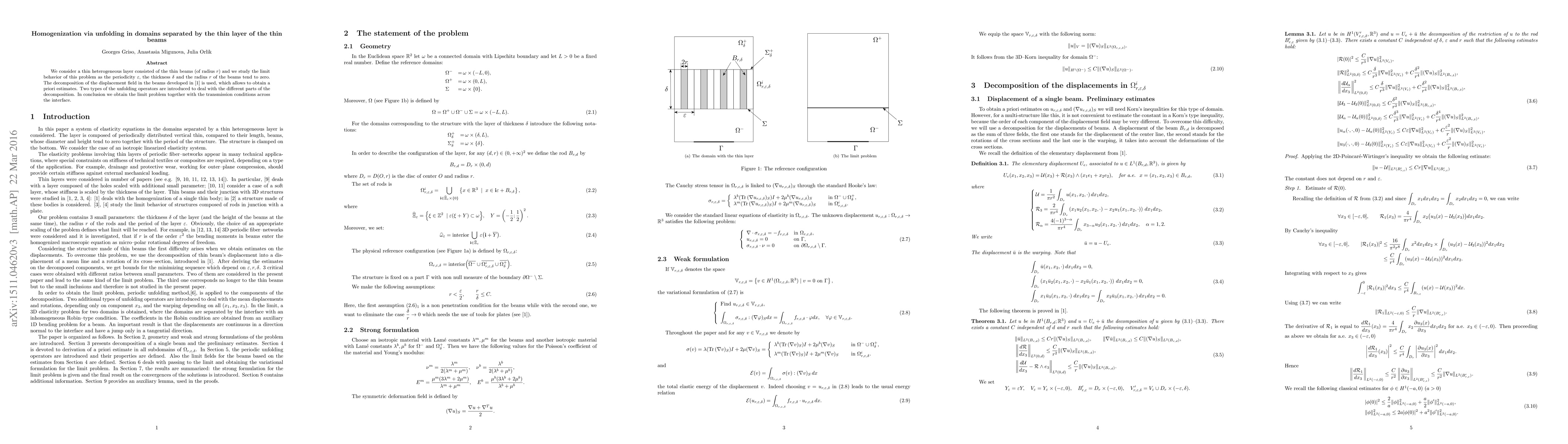 We consider a thin heterogeneous layer consisted of the thin beams (of radius $r$) and we study the limit behaviour of this problem as the periodicity $\varepsilon$, the thickness $\delta$ and the radius $r$ of the beams tend to zero. The decomposition of the displacement field in the beams developed in [Griso, Decompositions of displacements of thin structures, 2008] is used, which allows to obtain a priori estimates. Two types of the unfolding operators are introduced to deal with the different parts of the decomposition. In conclusion we obtain the limit problem together with the transmission conditions across the interface.