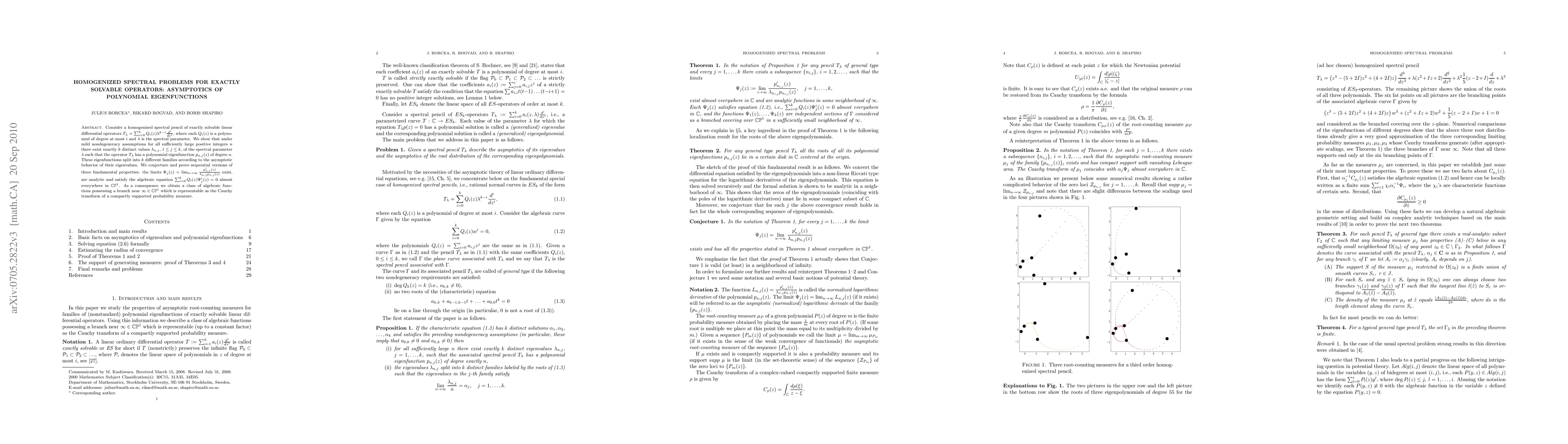 Consider a homogenized spectral pencil of exactly solvable linear differential operators $T_{\la}=\sum_{i=0}^k Q_{i}(z)\la^{k-i}\frac {d^i}{dz^i}$, where each $Q_{i}(z)$ is a polynomial of degree at most $i$ and $\la$ is the spectral parameter. We show that under mild nondegeneracy assumptions for all sufficiently large positive integers $n$ there exist exactly $k$ distinct values $\la_{n,j}$, $1\le j\le k$, of the spectral parameter $\la$ such that the operator $T_{\la}$ has a polynomial eigenfunction $p_{n,j}(z)$ of degree $n$. These eigenfunctions split into $k$ different families according to the asymptotic behavior of their eigenvalues. We conjecture and prove sequential versions of three fundamental properties: the limits $\Psi_{j}(z)=\lim_{n\to\infty} \frac{p_{n,j}'(z)}{\la_{n,j}p_{n,j}(z)}$ exist, are analytic and satisfy the algebraic equation $\sum_{i=0}^k Q_{i}(z) \Psi_{j}^i(z)=0$ almost everywhere in $\bCP$. As a consequence we obtain a class of algebraic functions possessing a branch near $\infty\in \bCP$ which is representable as the Cauchy transform of a compactly supported probability measure.