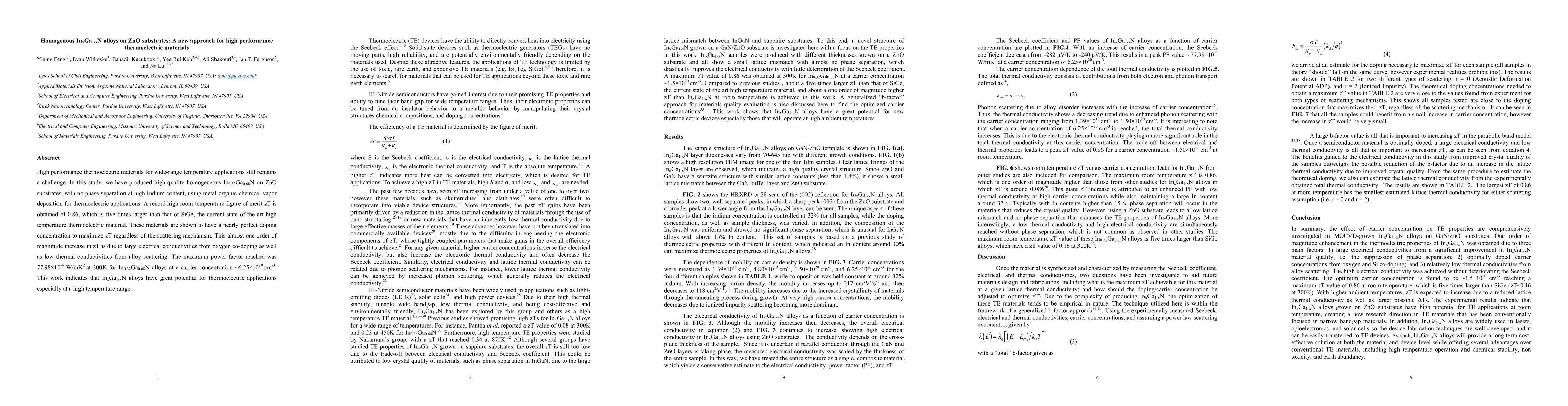 This study successfully produced high-quality homogeneous $In_{0.32}Ga_{0.68}N$ alloys on ZnO substrates using metal organic chemical vapor deposition, achieving a record high room temperature thermoelectric figure of merit (zT) of 0.86, significantly surpassing SiGe. The substantial increase in zT is attributed to high electrical conductivity and low thermal conductivity.