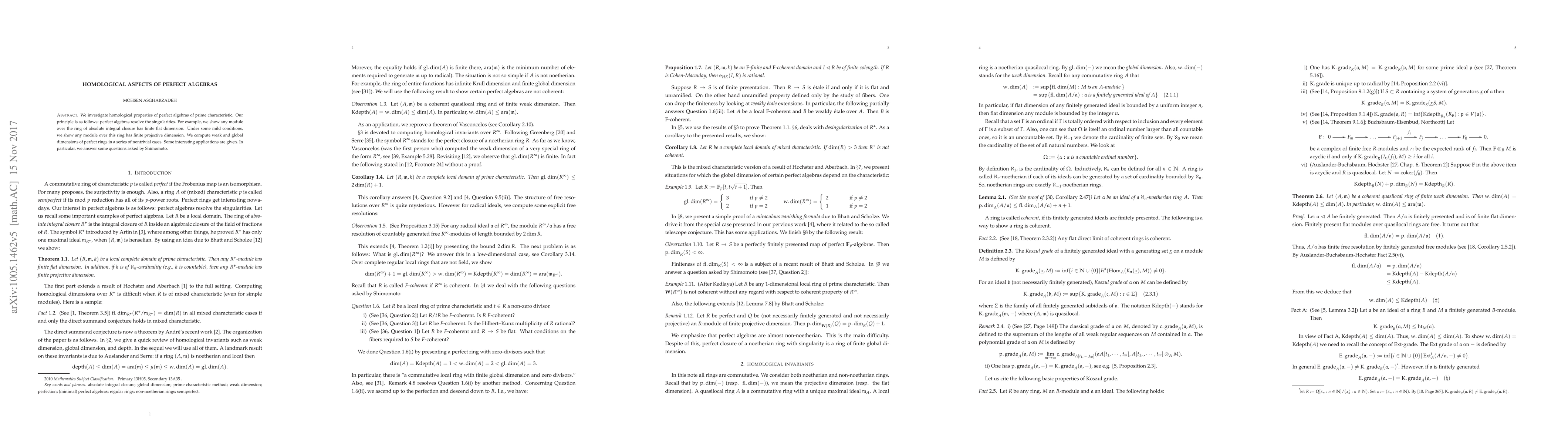 We investigate homological properties of perfect algebras of prime characteristic. The principle is as follows: perfect algebras resolve the singularities. For example, we show any module over the ring of absolute integral closure has finite flat dimension. Under some mild conditions, we show any module over that ring has finite projective dimension. We compute weak dimension and global dimension of perfect rings in a series of nontrivial cases. Some interesting applications are given. In particular, we answer some questions asked by Shimomoto.