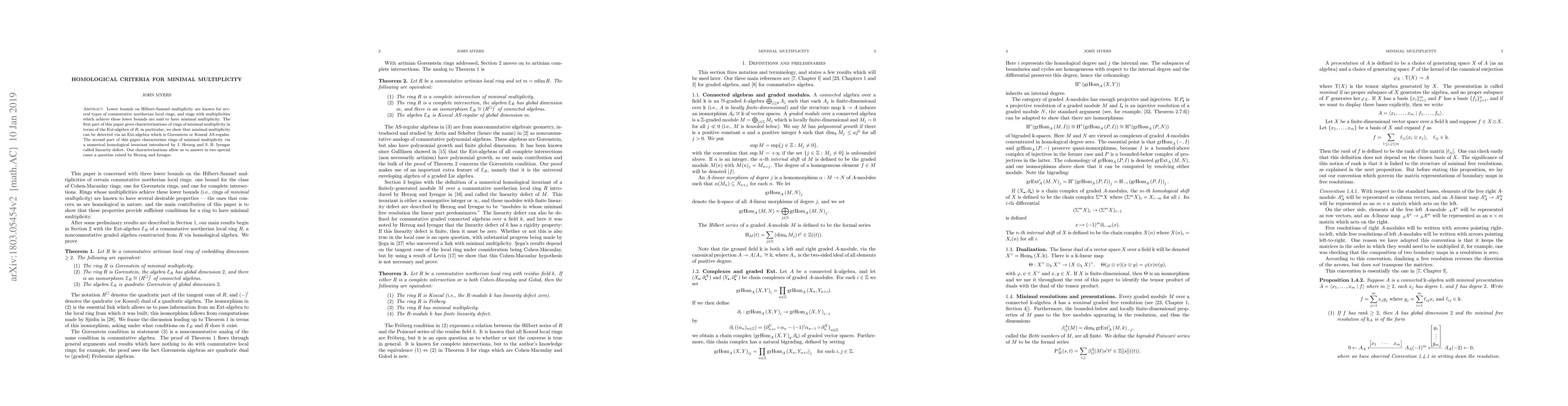 Lower bounds on Hilbert-Samuel multiplicity are known for several types of commutative noetherian local rings, and rings with multiplicities which achieve these lower bounds are said to have minimal multiplicity. The first part of this paper gives characterizations of rings of minimal multiplicity in terms of the Ext-algebra of the ring; in particular, we show that minimal multiplicity can be detected via an Ext-algebra which is Gorenstein or Koszul AS-regular. The second part of this paper characterizes rings of minimal multiplicity via a numerical homological invariant introduced by J. Herzog and S. B. Iyengar called linearity defect. Our characterizations allow us to answer in two special cases a question raised by Herzog and Iyengar.