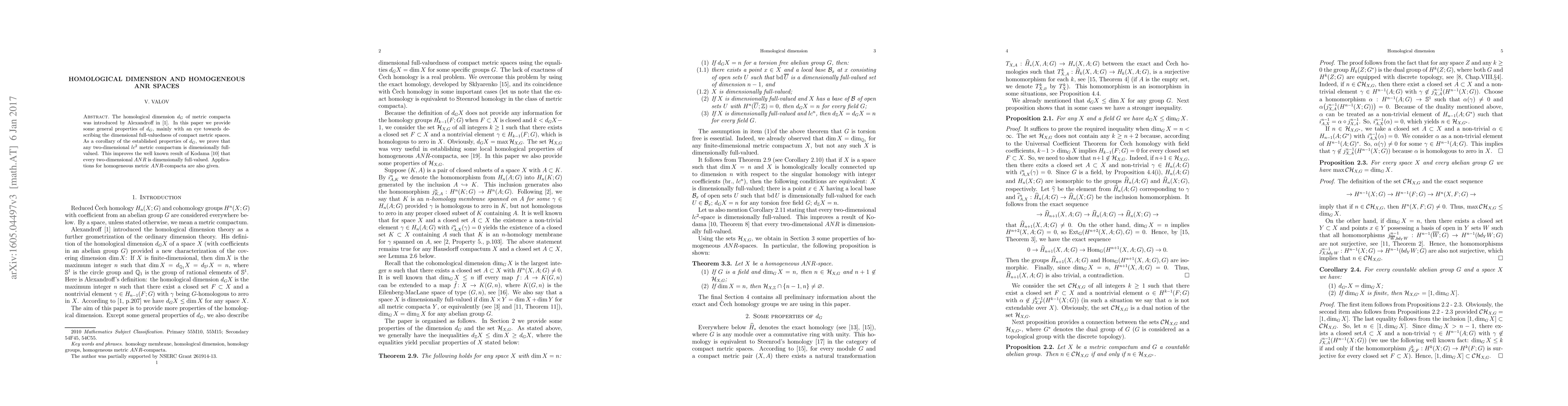 This paper explores the homological dimension $d_G$ of metric compacta, establishing its properties and demonstrating that two-dimensional $lc^2$ metric compacta are dimensionally full-valued, improving upon Kodama's result on two-dimensional $ANR$ spaces. It also applies these findings to homogeneous metric $ANR$-compacta.