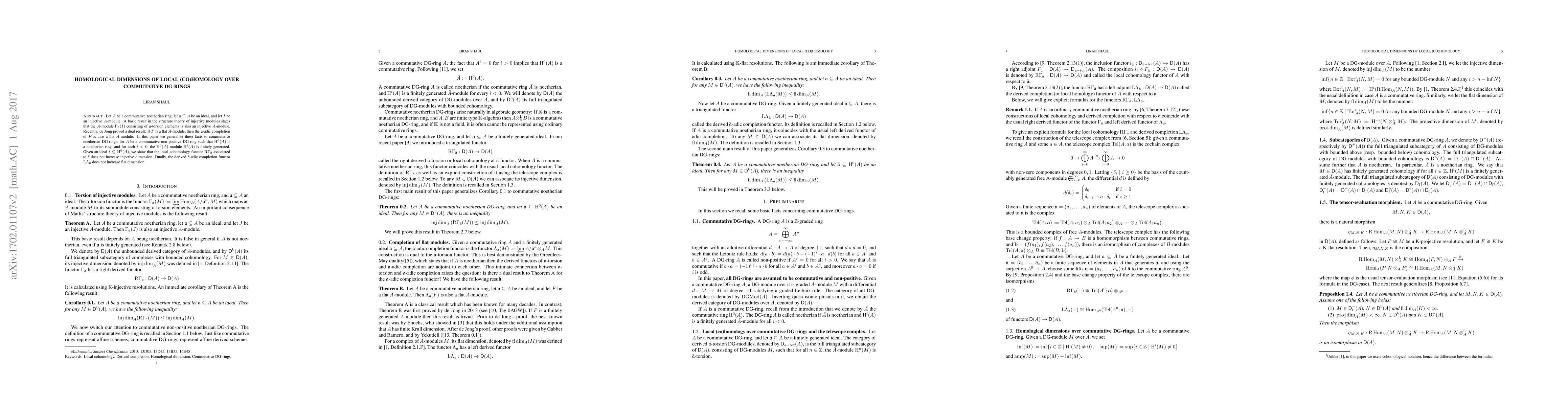 Let $A$ be a commutative noetherian ring, let $\mathfrak{a}\subseteq A$ be an ideal, and let $I$ be an injective $A$-module. A basic result in the structure theory of injective modules states that the $A$-module $\Gamma_{\mathfrak{a}}(I)$ consisting of $\mathfrak{a}$-torsion elements is also an injective $A$-module. Recently, de Jong proved a dual result: If $F$ is a flat $A$-module, then the $\mathfrak{a}$-adic completion of $F$ is also a flat $A$-module. In this paper we generalize these facts to commutative noetherian DG-rings: let $A$ be a commutative non-positive DG-ring such that $\mathrm{H}^0(A)$ is a noetherian ring, and for each $i<0$, the $\mathrm{H}^0(A)$-module $\mathrm{H}^i(A)$ is finitely generated. Given an ideal $\bar{\mathfrak{a}} \subseteq \mathrm{H}^0(A)$, we show that the local cohomology functor $\mathrm{R}\Gamma_{\bar{\mathfrak{a}}}$ associated to $\bar{\mathfrak{a}}$ does not increase injective dimension. Dually, the derived $\bar{\mathfrak{a}}$-adic completion functor $\mathrm{L}\Lambda_{\bar{\mathfrak{a}}}$ does not increase flat dimension.