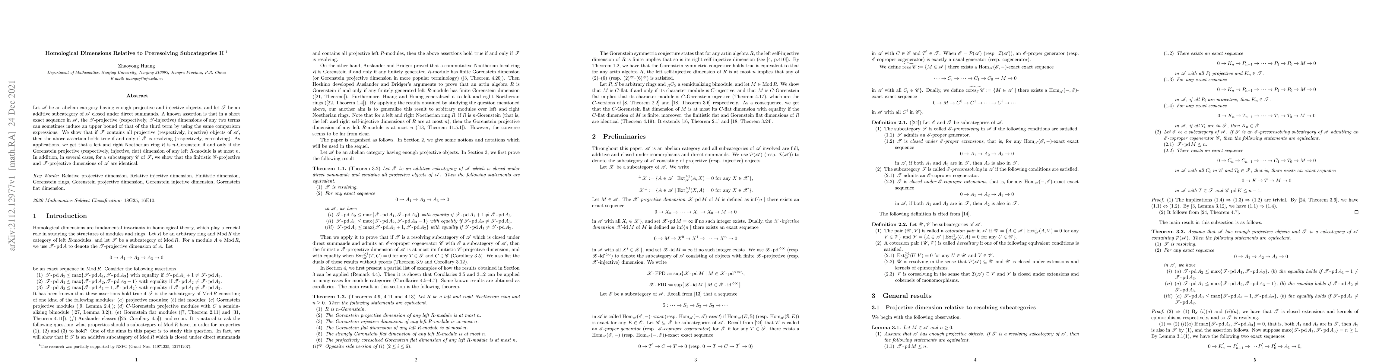 This paper explores the connection between preresolving subcategories in abelian categories and their projective or injective dimensions, proving that $\mathscr{T}$ being resolving or coresolving is necessary and sufficient for certain upper bounds to hold. It also demonstrates applications to Gorenstein dimensions in ring theory and establishes equality of finitistic dimensions in specific subcategories.