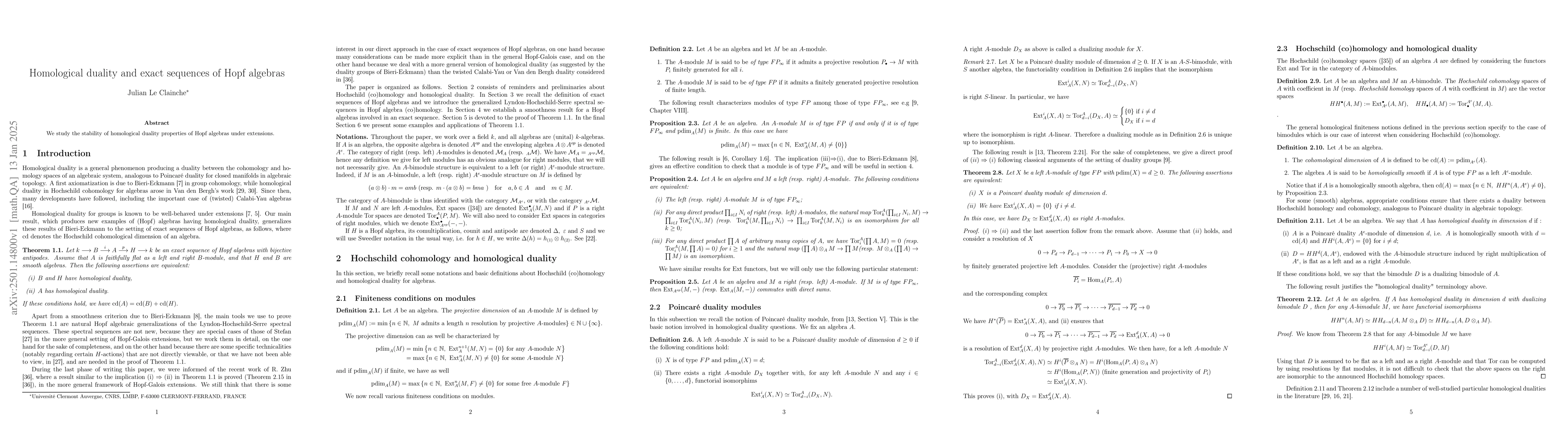 This paper investigates how homological duality properties of Hopf algebras remain stable under extensions, focusing on the behavior of exact sequences within these algebraic structures. The findings contribute to understanding the persistence of duality across different Hopf algebra extensions.