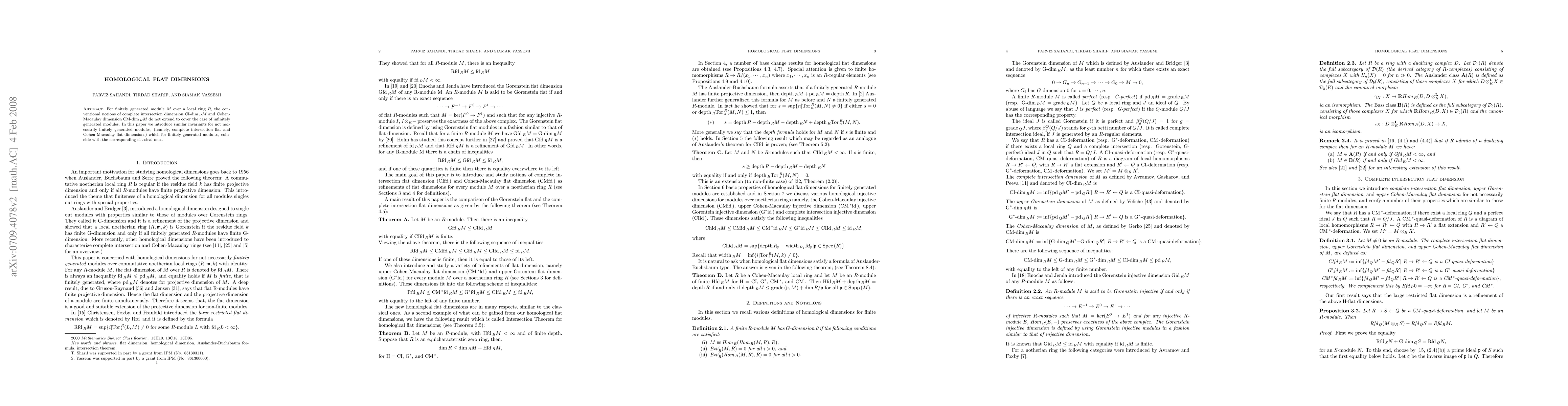 For finitely generated module $M$ over a local ring $R$, the conventional notions of complete intersection dimension $\cid_R M$ and Cohen-Macaulay dimension $\cmdim_R M$ do not extend to cover the case of infinitely generated modules. In this paper we introduce similar invariants for not necessarily finitely generated modules, (namely, complete intersection flat and Cohen-Macaulay flat dimensions) which for finitely generated modules, coincide with the corresponding classical ones.