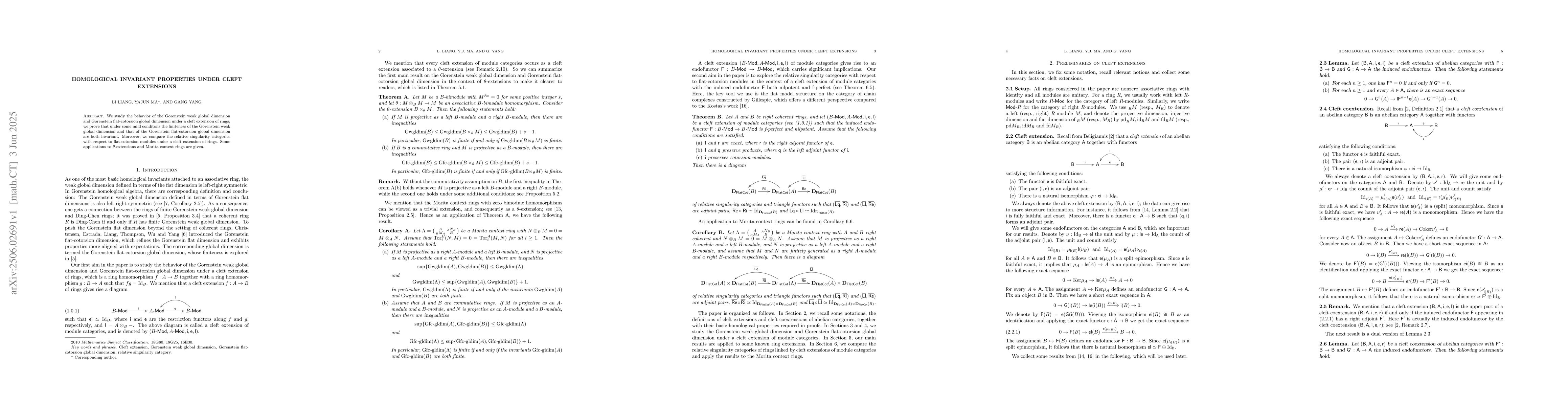 The paper investigates homological invariant properties under cleft extensions of rings, employing techniques from commutative algebra and homological algebra.