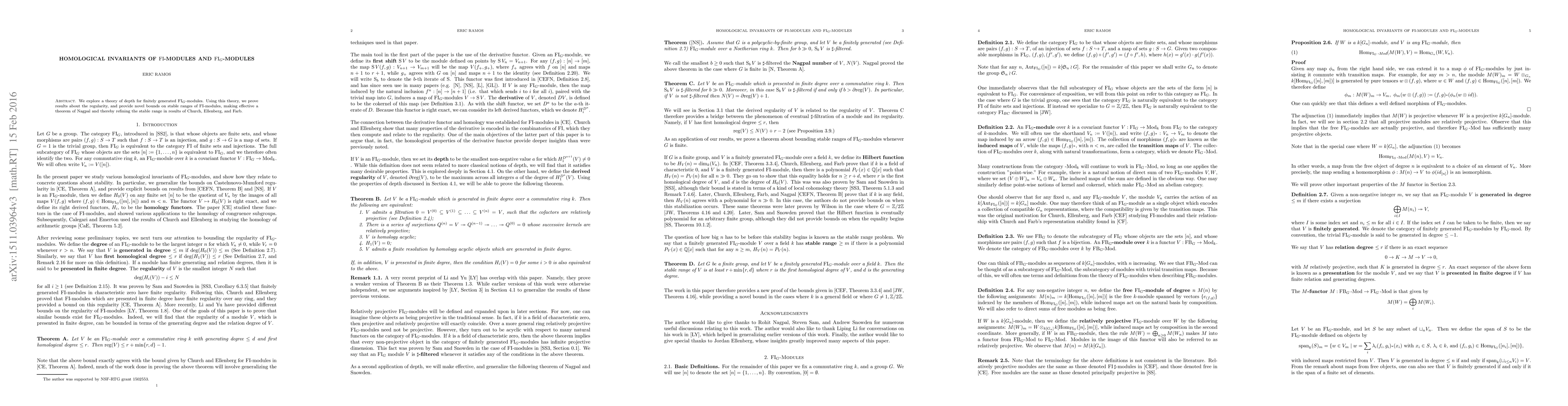 We explore a theory of depth for FI_G-modules which are presented in finite degrees. Using this theory, we prove results about the regularity, and provide novel bounds on stable ranges of FI-modules, making effective a theorem of Nagpal and thereby refining the stable range in results of Church, Ellenberg, and Farb.