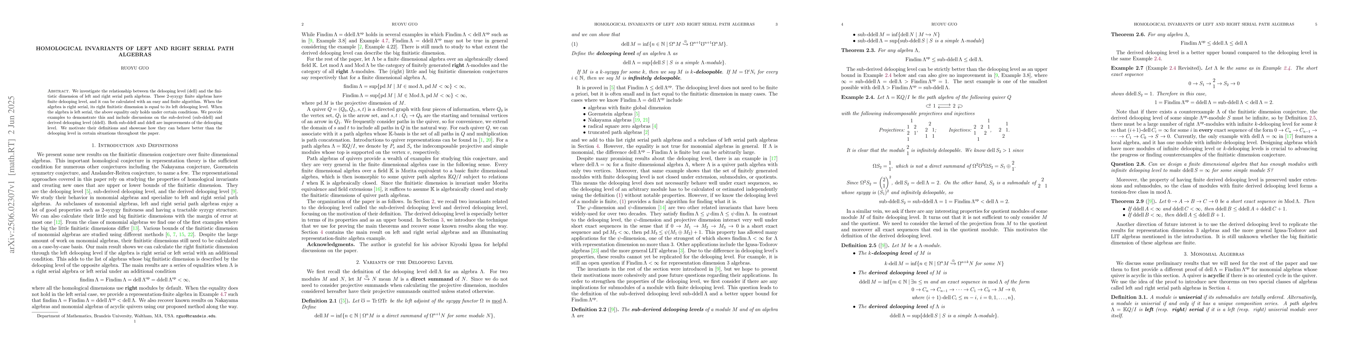 The paper explores the relationship between the delooping level (dell) and finitistic dimension of left and right serial path algebras, utilizing 2-syzygy finite algebras and developing an easy, finite algorithm for calculating dell.