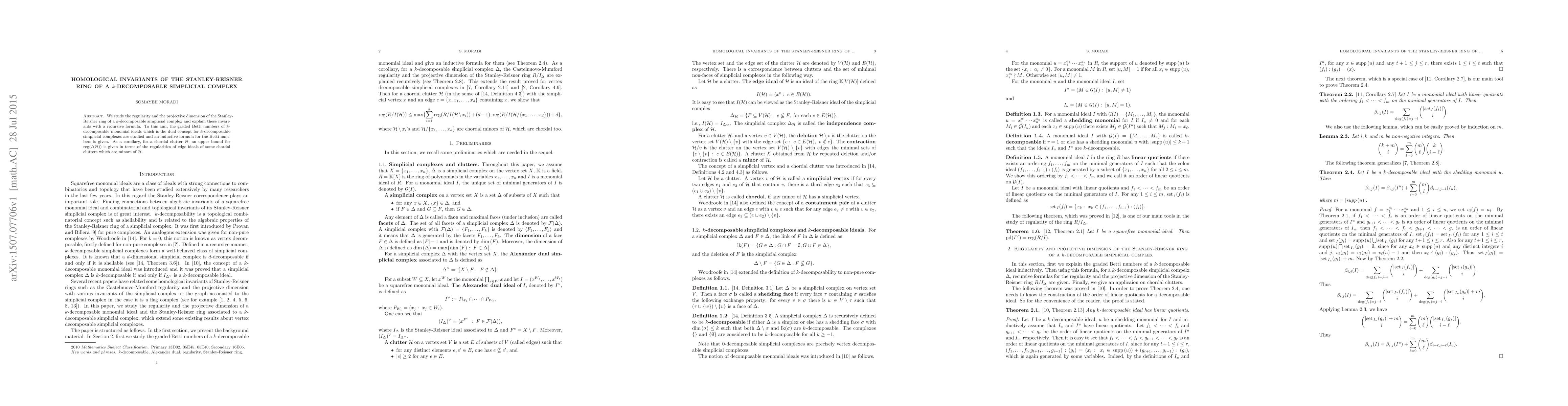 We study the regularity and the projective dimension of the Stanley-Reisner ring of a $k$-decomposable simplicial complex and explain these invariants with a recursive formula. To this aim, the graded Betti numbers of $k$-decomposable monomial ideals which is the dual concept for $k$-decomposable simplicial complexes are studied and an inductive formula for the Betti numbers is given. As a corollary, for a chordal clutter $\mathcal{H}$, an upper bound for $reg(I(\mathcal{H}))$ is given in terms of the regularities of edge ideals of some chordal clutters which are minors of $\mathcal{H}$.