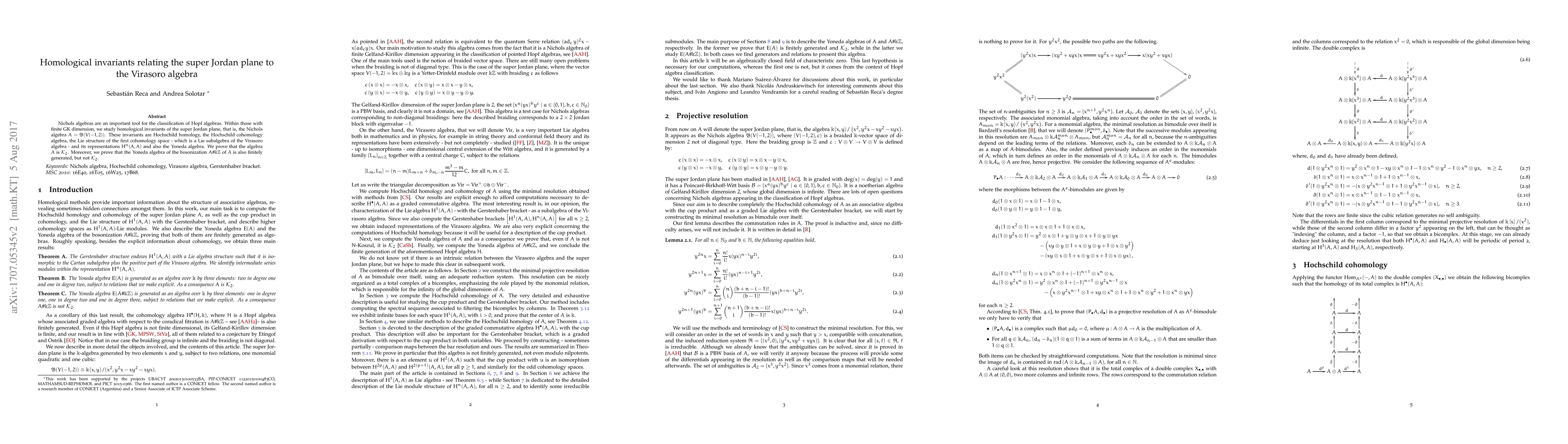 This paper investigates homological invariants of the Nichols algebra $A=B(V(-1,2))$, which represents the super Jordan plane. It establishes connections between the Hochschild cohomology, Lie structure, and representations of $A$, revealing a Lie subalgebra of the Virasoro algebra. The study concludes that $A$ is $K_2$ but its bosonization's Yoneda algebra is finitely generated yet not $K_2$.