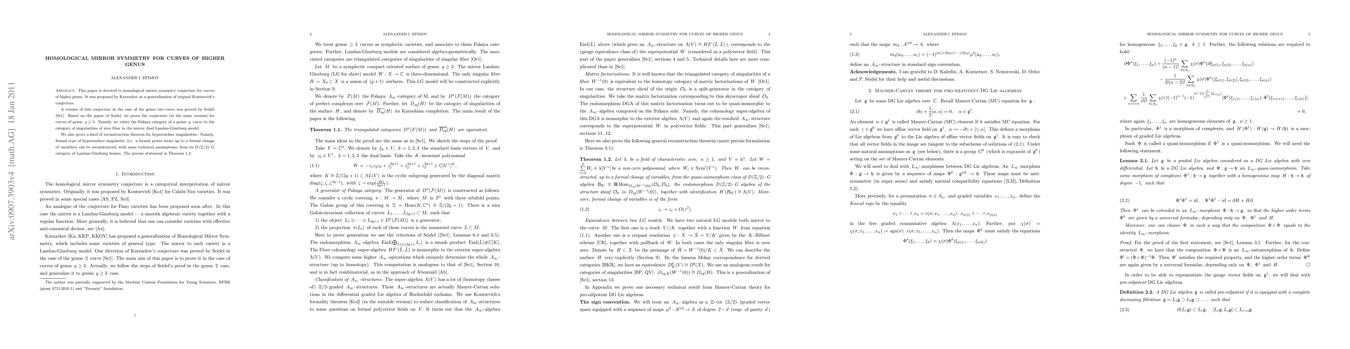This paper generalizes Seidel's proof of Katzarkov's conjecture on homological mirror symmetry for genus two curves, extending it to curves of genus $g \geq 3$. It establishes a relationship between the Fukaya category of higher genus curves and Landau-Ginzburg branes, and proves a reconstruction theorem for hypersurface singularities using their D$(\Z/2)$-G category.