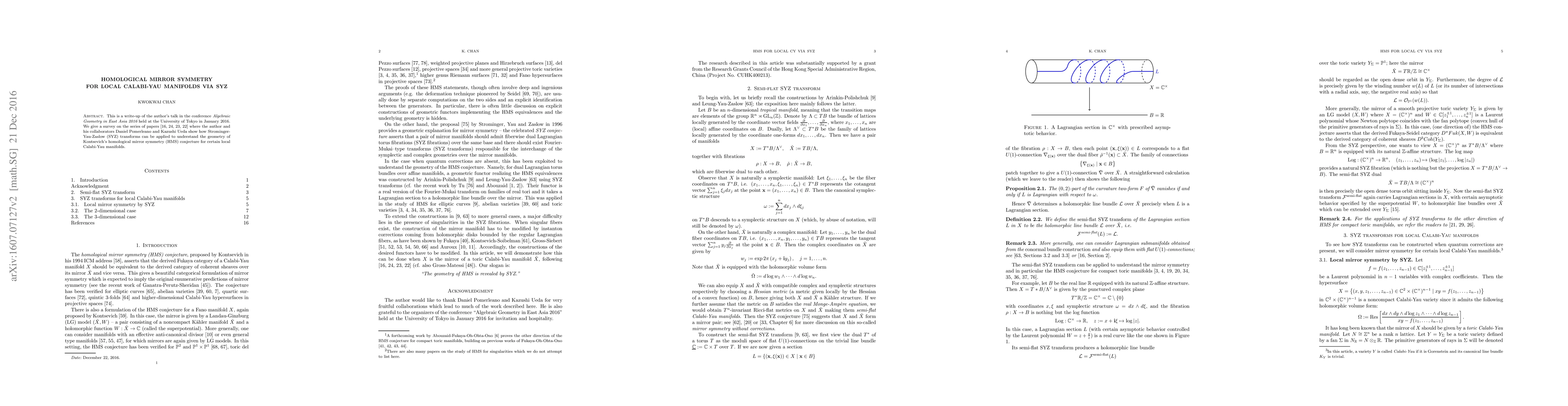 This paper surveys the application of Strominger-Yau-Zaslow (SYZ) transforms to elucidate Kontsevich's homological mirror symmetry (HMS) conjecture for local Calabi-Yau manifolds, building on joint work with Daniel Pomerleano and Kazushi Ueda. The results were presented at the "Algebraic Geometry in East Asia 2016" conference in Tokyo.