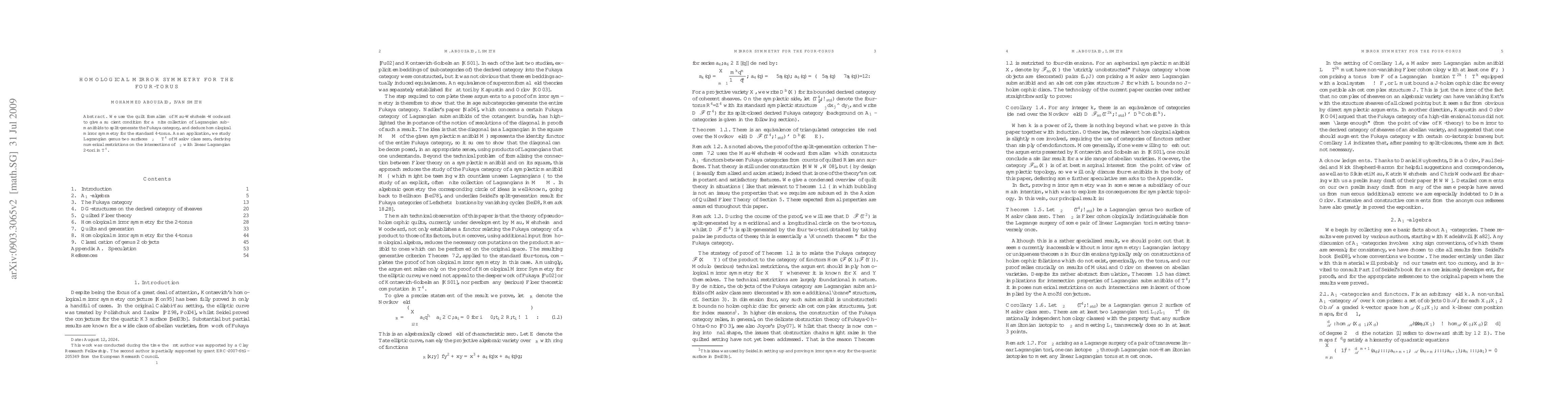 This paper establishes homological mirror symmetry for the four-torus using the quilt formalism, demonstrating conditions for Lagrangian submanifolds to generate the Fukaya category, and applies this to study intersections of genus two Lagrangian surfaces with linear 2-tori.