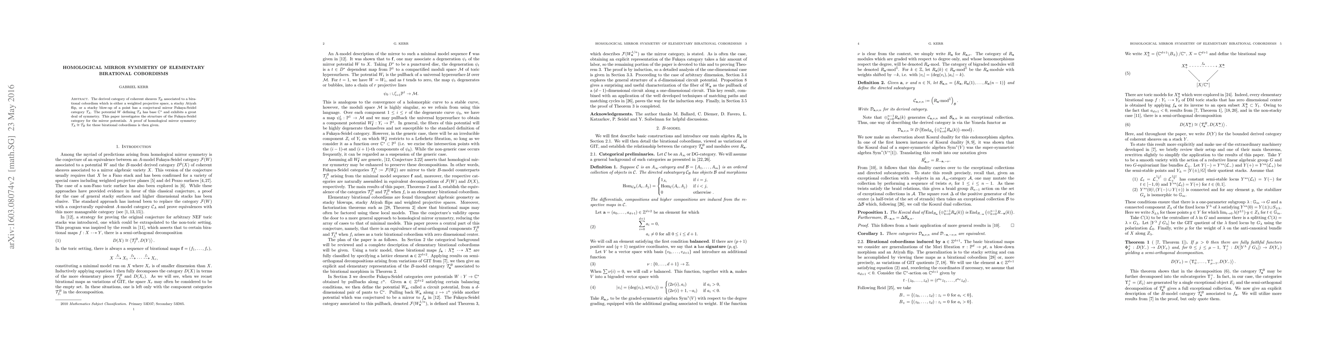 This paper proves homological mirror symmetry for elementary birational cobordisms, showing that the derived category of coherent sheaves on these cobordisms is isomorphic to the mirror Fukaya-Seidel category defined by a symmetric potential.