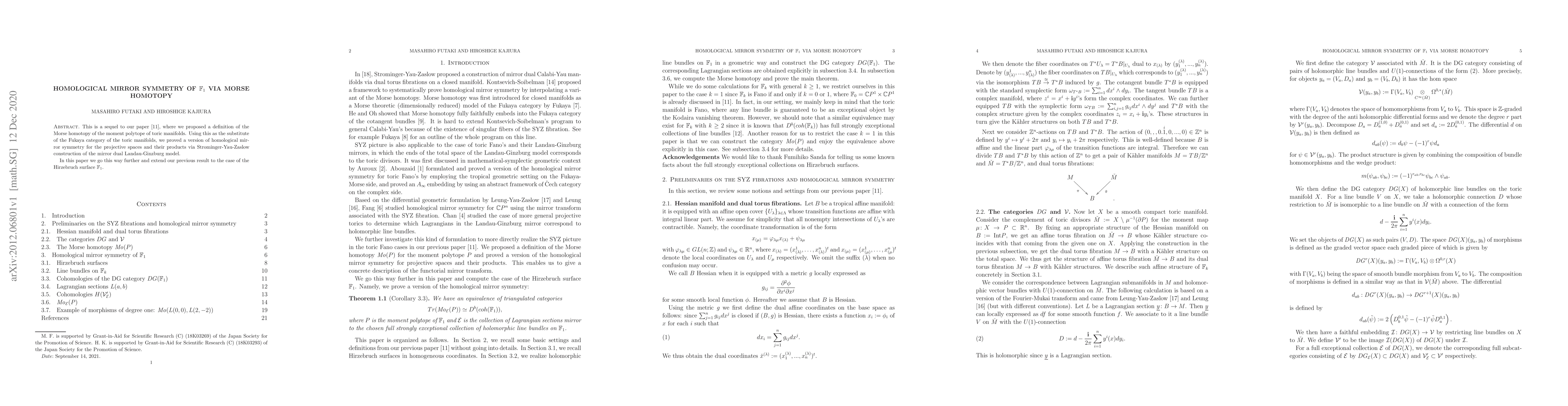 This paper extends a previous result on homological mirror symmetry for projective spaces by applying the Morse homotopy definition to the moment polytope of toric manifolds, proving the symmetry for the Hirzebruch surface $\mathbb{F}_1$ using the Strominger-Yau-Zaslow construction for the mirror dual Landau-Ginzburg model.