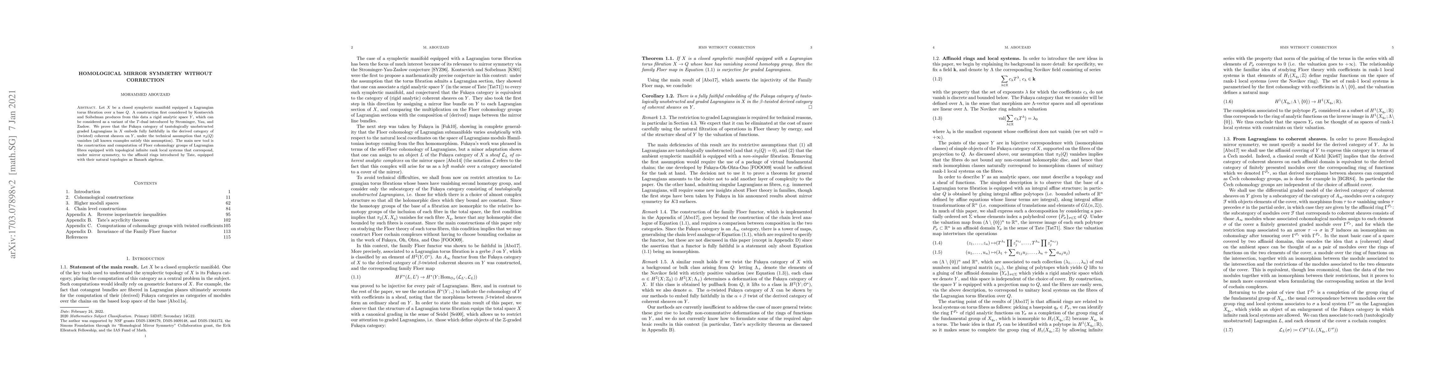 Title: Homological mirror symmetry without corrections Summary: The paper establishes homological mirror symmetry for closed symplectic manifolds with Lagrangian torus fibrations by embedding the Fukaya category of Lagrangians in the derived category of coherent sheaves on the dual rigid analytic space, using Floer cohomology computations of Lagrangian fibers with infinite rank local systems.