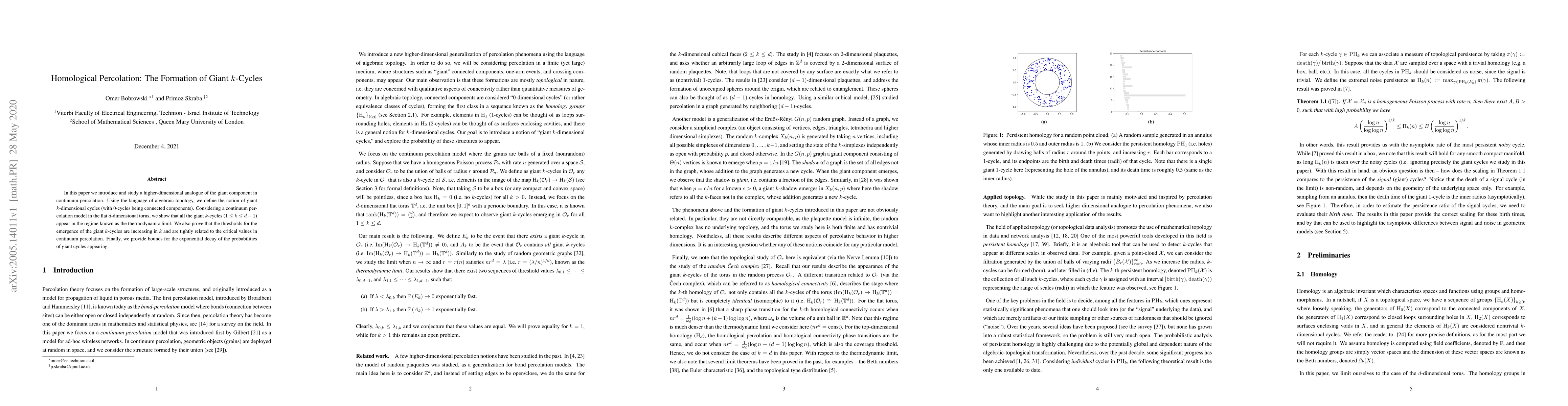 This paper explores a higher-dimensional analogue of the giant component in continuum percolation, defining giant k-cycles in algebraic topology. It demonstrates the emergence of all giant k-cycles in the thermodynamic limit of a continuum percolation model on the d-dimensional torus, proving that the thresholds for their appearance increase with k and relate to continuum percolation critical values.