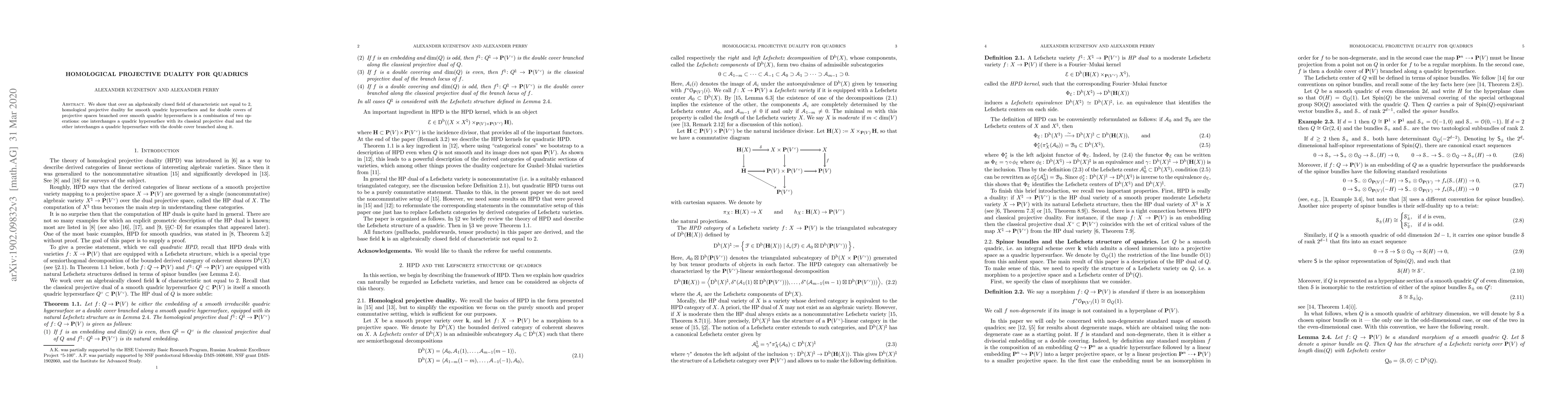 We show that over an algebraically closed field of characteristic not equal to 2, homological projective duality for smooth quadric hypersurfaces and for double covers of projective spaces branched over smooth quadric hypersurfaces is a combination of two operations: one interchanges a quadric hypersurface with its classical projective dual and the other interchanges a quadric hypersurface with the double cover branched along it.