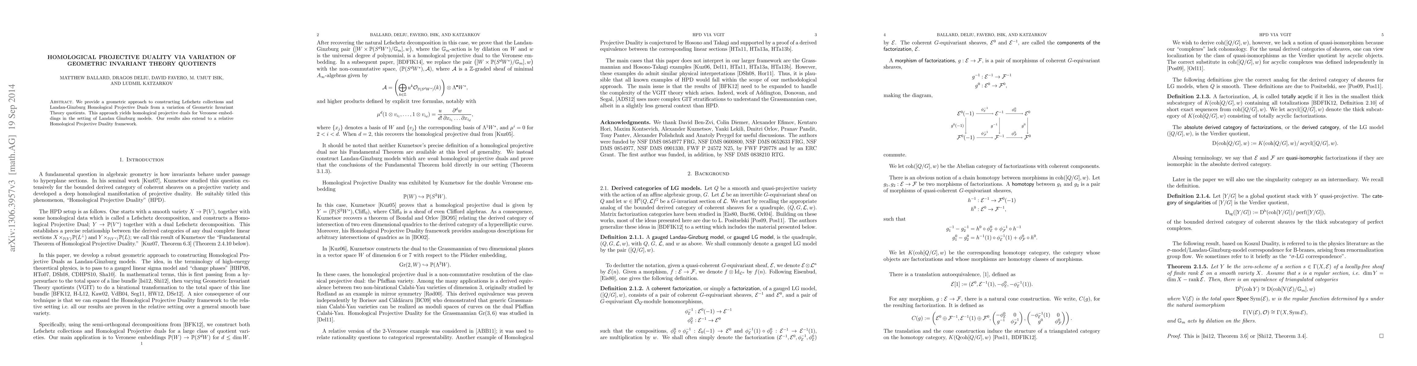 We provide a geometric approach to constructing Lefschetz collections and Landau-Ginzburg Homological Projective Duals from a variation of Geometric Invariant Theory quotients. This approach yields homological projective duals for Veronese embeddings in the setting of Landau Ginzburg models. Our results also extend to a relative Homological Projective Duality framework.