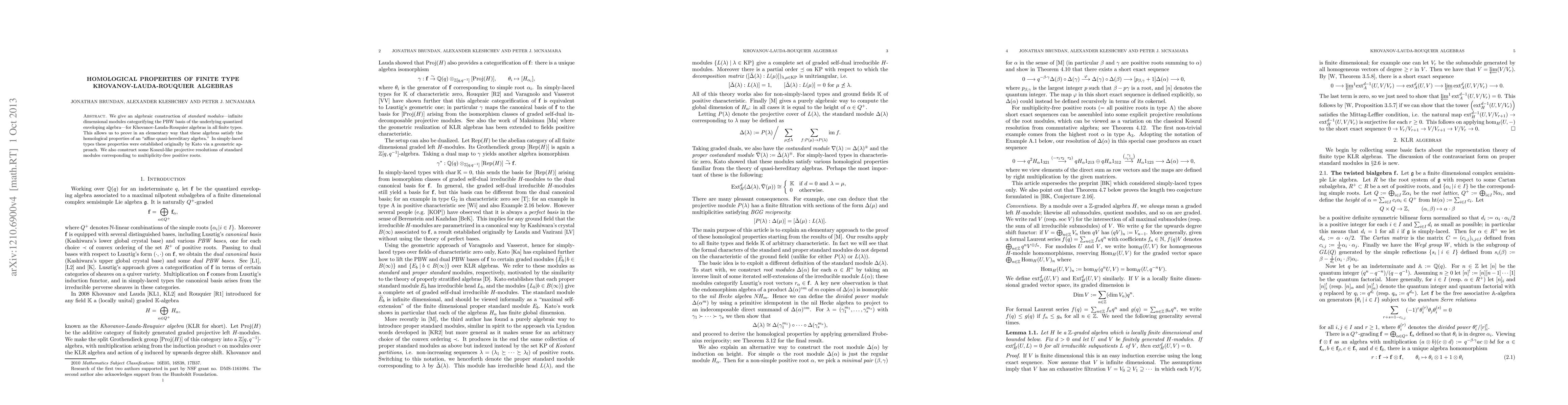 We give an algebraic construction of standard modules (infinite dimensional modules categorifying the PBW basis of the underlying quantized enveloping algebra) for Khovanov-Lauda-Rouquier algebras in all finite types. This allows us to prove in an elementary way that these algebras satisfy the homological properties of an `affine quasi-hereditary algebra.' In simply-laced types these properties were established originally by Kato via a geometric approach. We also construct some Koszul-like projective resolutions of standard modules corresponding to multiplicity-free positive roots.
