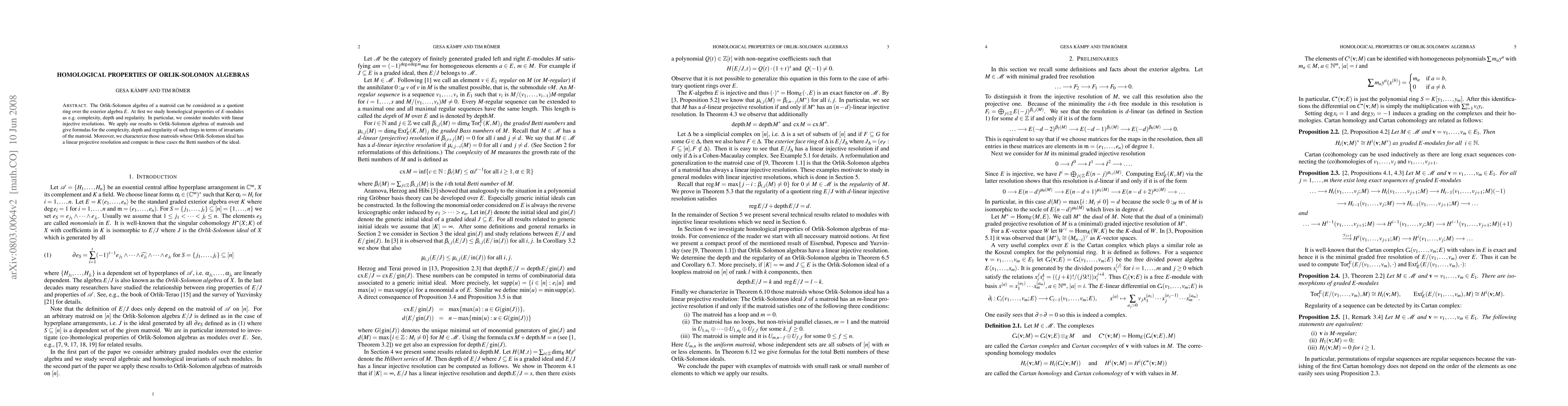 The Orlik-Solomon algebra of a matroid can be considered as a quotient ring over the exterior algebra E. At first we study homological properties of E-modules as e.g. complexity, depth and regularity. In particular, we consider modules with linear injective resolutions. We apply our results to Orlik-Solomon algebras of matroids and give formulas for the complexity, depth and regularity of such rings in terms of invariants of the matroid. Moreover, we characterize those matroids whose Orlik-Solomon ideal has a linear projective resolution and compute in these cases the Betti numbers of the ideal.