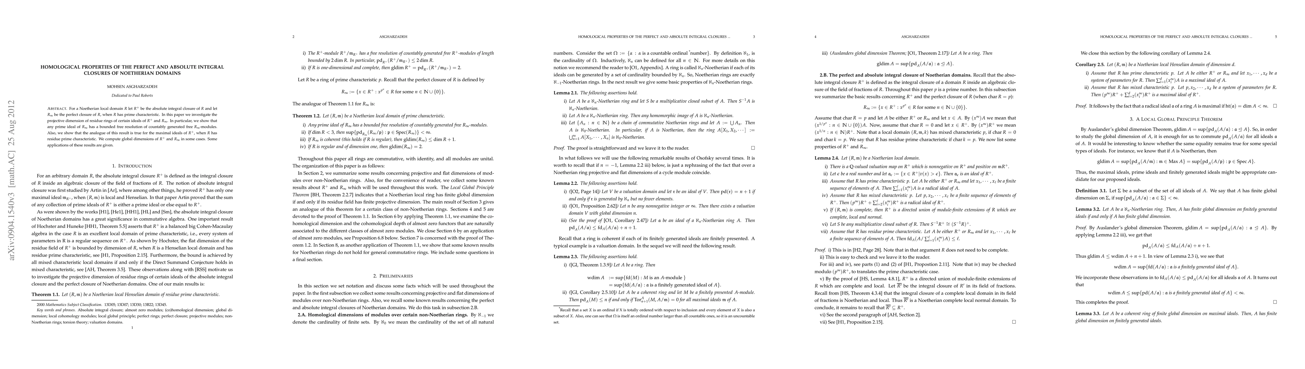 For a Noetherian local domain $R$ let $R^+$ be the absolute integral closure of $R$ and let $R_{\infty}$ be the perfect closure of $R$, when $R$ has prime characteristic. In this paper we investigate the projective dimension of residue rings of certain ideals of $R^+$ and $R_{\infty}$. In particular, we show that any prime ideal of $R_{\infty}$ has a bounded free resolution of countably generated free $R_{\infty}$-modules. Also, we show that the analogue of this result is true for the maximal ideals of $R^+$, when $R$ has residue prime characteristic. We compute global dimensions of $R^+$ and $R_{\infty}$ in some cases. Some applications of these results are given.