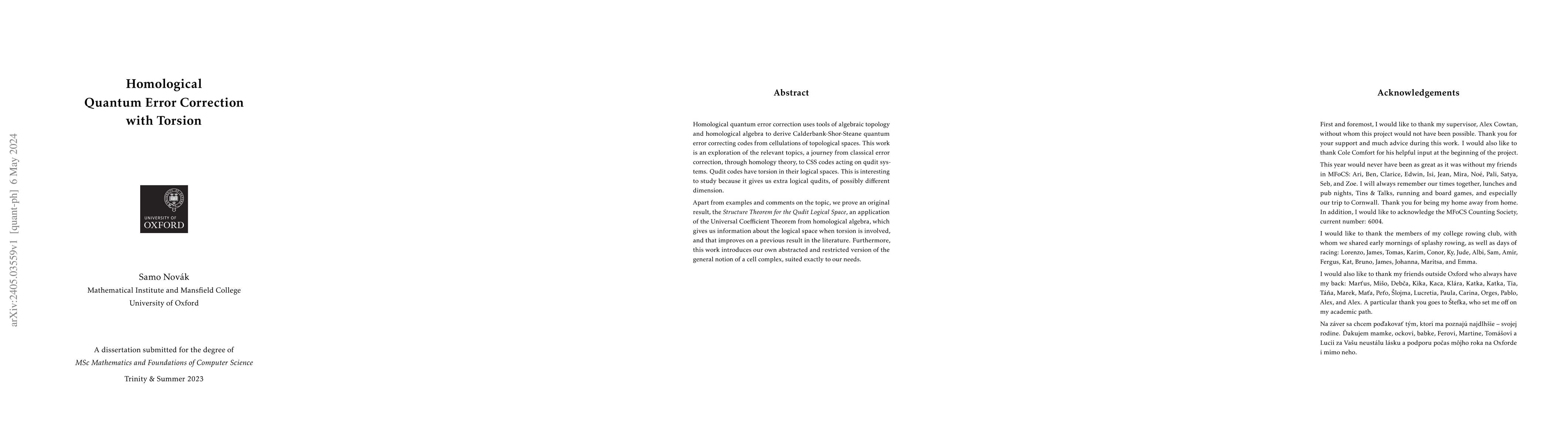 Homological quantum error correction uses tools of algebraic topology and homological algebra to derive Calderbank-Shor-Steane quantum error correcting codes from cellulations of topological spaces. This work is an exploration of the relevant topics, a journey from classical error correction, through homology theory, to CSS codes acting on qudit systems. Qudit codes have torsion in their logical spaces. This is interesting to study because it gives us extra logical qudits, of possibly different dimension. Apart from examples and comments on the topic, we prove an original result, the Structure Theorem for the Qudit Logical Space, an application of the Universal Coefficient Theorem from homological algebra, which gives us information about the logical space when torsion is involved, and that improves on a previous result in the literature. Furthermore, this work introduces our own abstracted and restricted version of the general notion of a cell complex, suited exactly to our needs.