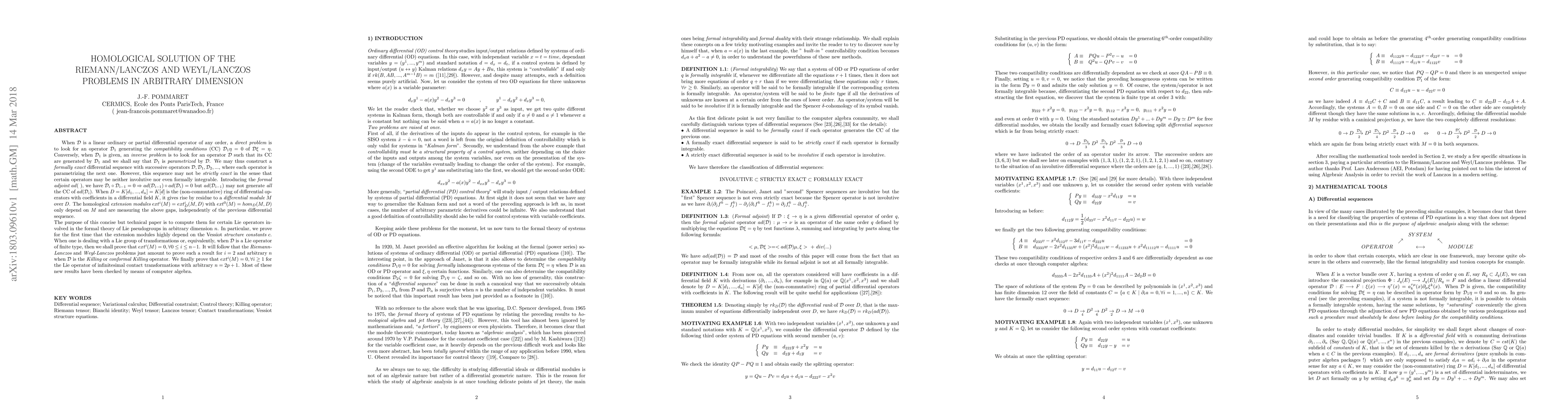 When ${\cal{D}}$ is a linear partial differential operator of any order, a direct problem is to look for an operator ${\cal{D}}_1$ generating the compatibility conditions (CC) ${\cal{D}}_1\eta=0$ of ${\cal{D}}\xi=\eta$. We may thus construct a differential sequence with successive operators ${\cal{D}},{\cal{D}}_1,{\cal{D}}_2, ...$, where each operator is generating the CC of the previous one. Introducing the formal adjoint $ad( )$, we have ${\cal{D}}_i\circ {\cal{D}}_{i-1}=0 \Rightarrow ad({\cal{D}}_{i-1}) \circ ad({\cal{D}}_i)=0$ but $ad({\cal{D}}_{i-1})$ may not generate all the CC of $ad({\cal{D}}_i)$. When $D=K[d_1,...,d_n]=K[d]$ is the (non-commutative) ring of differential operators with coefficients in a differential field $K$, it gives rise by residue to a differential module $M$ over $D$. The homological extension modules $ext^i(M)=ext^i_D(M,D)$ with $ext^0(M)=hom_D(M,D)$ only depend on $M$ and are measuring the above gaps, independently of the previous differential sequence.The purpose of this rather technical paper is to compute them for certain Lie operators involved in the formal theory of Lie pseudogroups in arbitrary dimension $n$. In particular, we prove that the extension modules highly depend on the Vessiot structure constants $c$. When one is dealing with a Lie group of transformations or, equivalently, when ${\cal{D}}$ is a Lie operator of finite type, then we shall prove that $ext^i(M)=0, \forall 0\leq i \leq n-1$. It will follow that the Riemann-Lanczos and Weyl-Lanczos problems just amount to prove such a result for $i=2$ and arbitrary $n$ when ${\cal{D}}$ is the Killing or conformal Killing operator. We finally prove that ${ext}^i(M)=0, \forall i\geq 1$ for the Lie operator of infinitesimal contact transformations with arbitrary $n=2p+1$. Most of these new results have been checked by means of computer algebra.