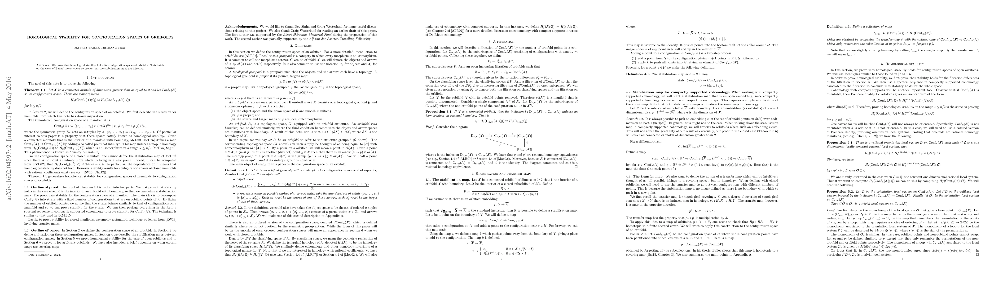 Homological stability for configuration spaces of orbifolds is proven, building on Bailes' thesis that establishes the injectivity of stabilization maps. This result contributes to understanding the topological structure of these spaces.