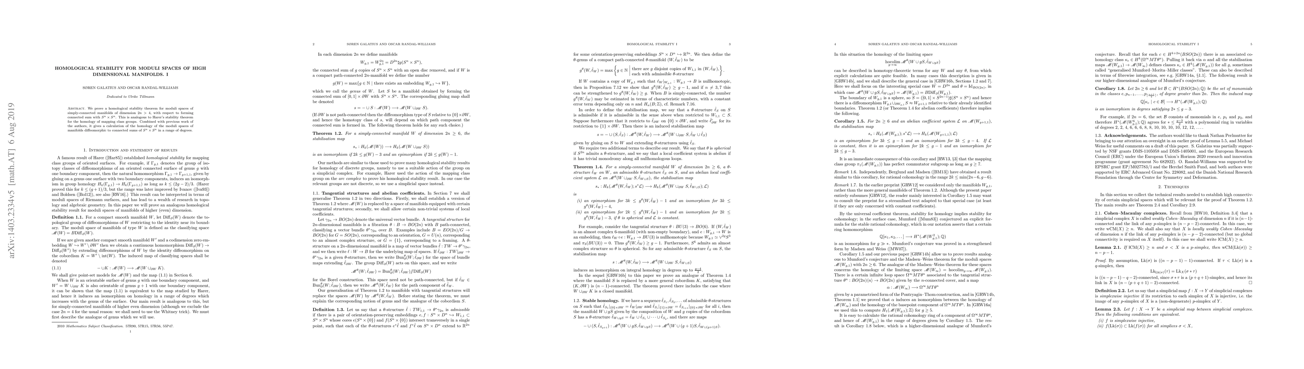 The paper proves homological stability for moduli spaces of simply-connected manifolds of dimension $2n > 4$ under connected sum with $S^n \times S^n$, analogous to Harer's stability theorem for mapping class groups, enabling the calculation of their homology in specified dimensions.