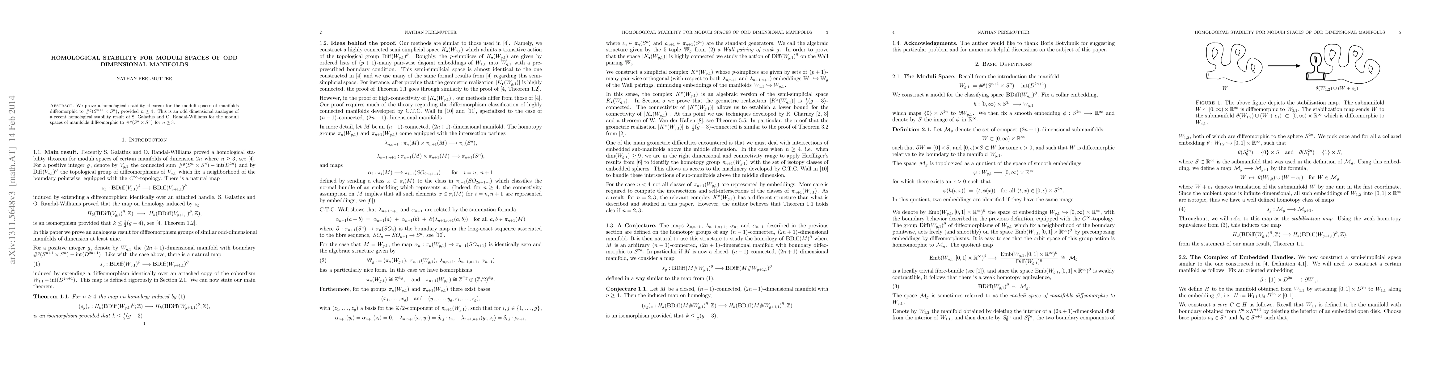 The paper proves a homological stability theorem for moduli spaces of odd-dimensional manifolds $\#^{g}(S^{n+1}\times S^{n})$ when $n \geq 4$, extending a similar result for even-dimensional cases to the odd-dimensional analogue.